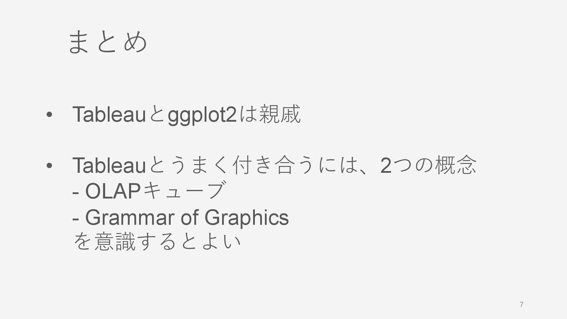 7 まとめ • Tableauとggplot2は親戚 • Tableauとうまく付き合うには、2つの概念 - OLAPキューブ - Grammar