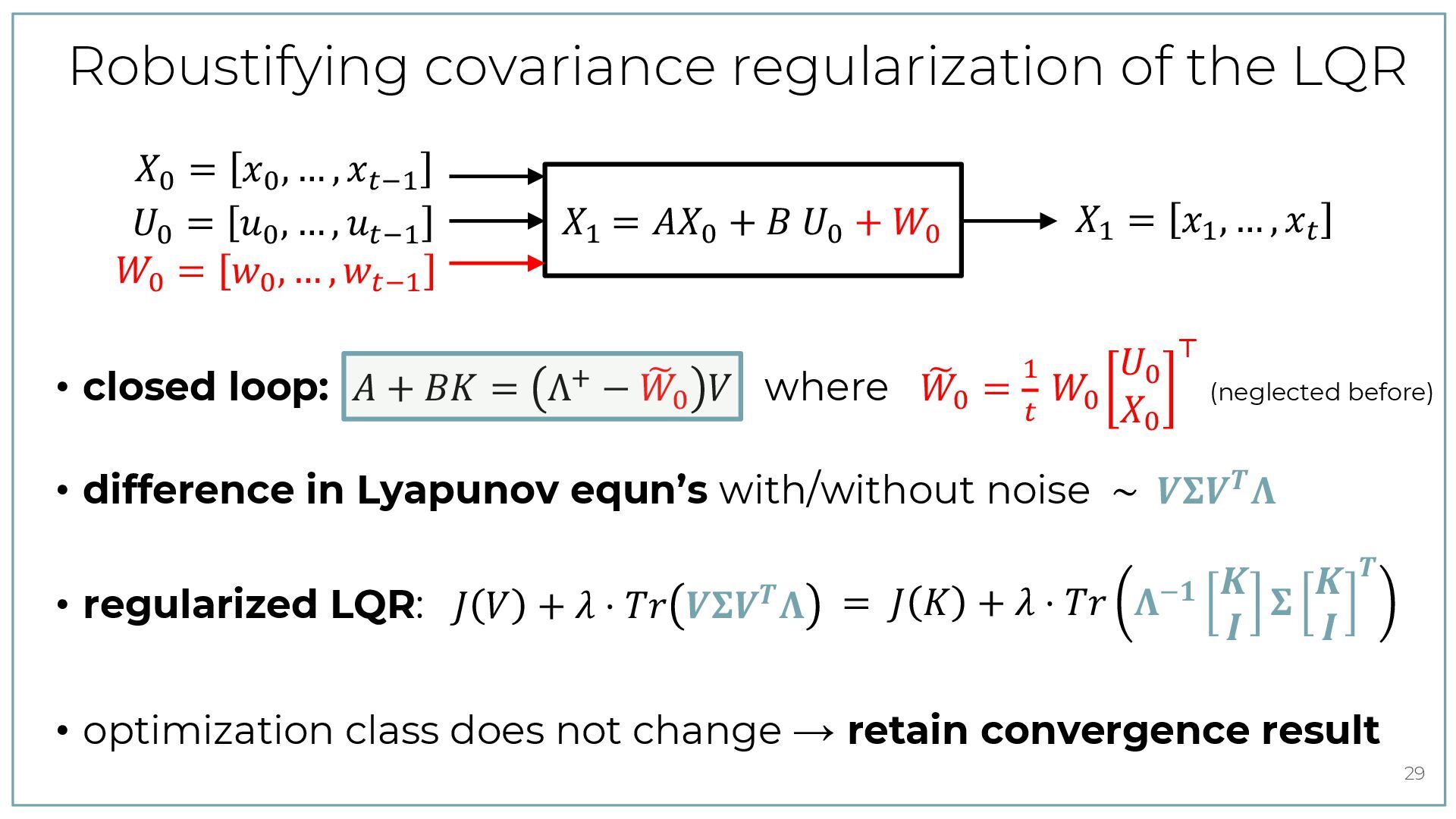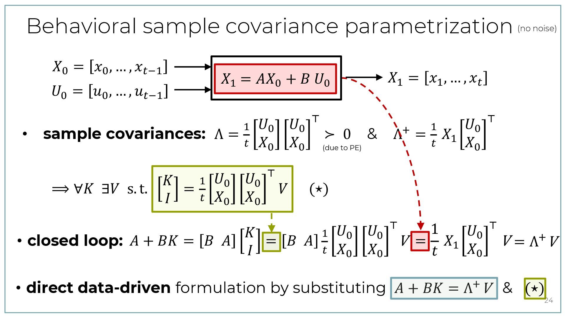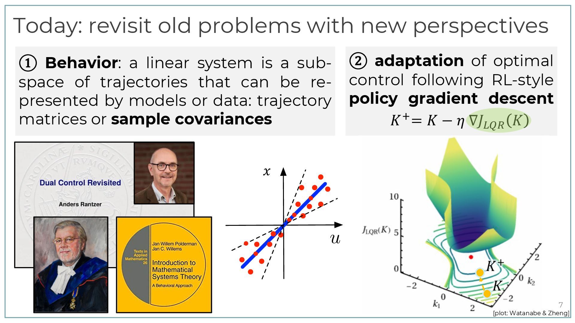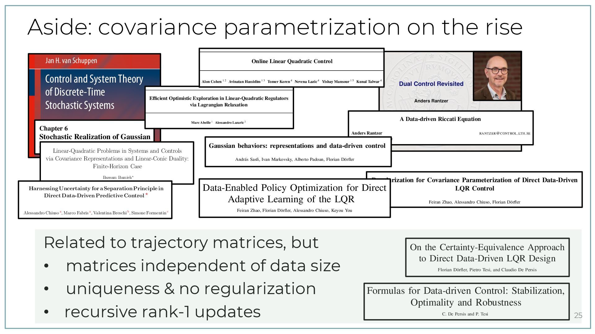 [email protected]>. Proceedings of the 37th International Conference on Machine Learning, Vienna, Austria, PMLR 119, 2020. Copyright 2020 by the author(s). Confidence-based exploration. Bittanti et al. (2006) intro- duced an adaptive control system based on the “bet on best” principle and proved asymptotic performance guarantees showing that their method would eventually converge to the optimal control. Abbasi-Yadkori & Szepesvári (2011) later proved a finite-time e O( p T) regret bound for OFU-LQ, later generalized to less restrictive stabilization and noise assumptions by Faradonbeh et al. (2017). Unfortunately, nei- ther exploration strategy comes with a computationally effi- cient algorithm to solve the optimistic LQR, and thus they cannot be directly implemented. On the TS side, Ouyang et al. (2017) proved a e O( p T) regret for the Bayesian regret, while Abeille & Lazaric (2018) showed that a similar bound holds in the frequentist case but restricted to 1-dimensional problems. While TS-based approaches require solving a single (random) LQR, the theoretical analysis of Abeille & Lazaric (2018) suggests that a new LQR instance should be solved at each time step, thus leading to a computational complexity growing linearly with the total number of steps. On the other hand, OFU-based methods allow for “lazy” updates, which require solving an optimistic LQR only a logarithmic number of times w.r.t. the total number of steps. A similar lazy-update scheme is used by Dean et al. (2018), who leveraged robust control theory to devise the first learn- ing algorithm with polynomial complexity and sublinear regret. Nonetheless, the resulting adaptive algorithm suffers from a e O(T2/3) regret, which is significantly worse than the e O( p T) achieved by OFU-LQ. To the best of our knowledge, the only efficient algorithm for confidence-based exploration with e O( p T) regret has been recently proposed by Cohen et al. (2019). Their method, called OSLO, leverages an SDP formulation of the LQ prob- lem, where an optimistic version of the constraints is used. As such, it translates the original non-convex OFU-LQ opti- mization problem into a convex SDP. While solving an SDP is known to have polynomial complexity, no explicit analysis is provided and it is said that the runtime may scale polyno- mially with LQ-specific parameters and the time horizon T (Cor. 5), suggesting that OSLO may become impractical for moderately large T. Furthermore, OSLO requires an initial system identification phase of length e O( p T) to properly initialize the method. This strong requirement effectively reduces OSLO to an explore-then-commit strategy, whose arXiv:2007.06482v1 [stat.ML] 13 Jul 2020 Harnessing Uncertainty for a Separation Principle in Direct Data-Driven Predictive Control ω Alessandro Chiuso a, Marco Fabris a, Valentina Breschi b, Simone Formentin c aDepartment of Information Engineering, University of Padova, Via Gradenigo 6/b, 35131 Padova, Italy. bDepartment of Electrical Engineering, Eindhoven University of Technology, 5600 MB Eindhoven, The Netherlands. cDipartimento di Elettronica, Informazione e Bioingegneria, Politecnico di Milano, P.za L. Da Vinci, 32, 20133 Milano, Italy. Abstract Model Predictive Control (MPC) is a powerful method for complex system regulation, but its reliance on an accurate model poses many limitations in real-world applications. Data-driven predictive control (DDPC) aims at overcoming this limitation, by relying on historical data to provide information on the plant to be controlled. In this work, we present a unified stochastic framework for direct DDPC, where control actions are obtained by optimizing the Final Control Error (FCE), which is directly computed from available data only and automatically weighs the impact of uncertainty on the control objective. Our framework allows us to establish a separation principle for Predictive Control, elucidating the role that predictive models and their uncertainty play in DDPC. Moreover, it generalizes existing DDPC methods, like regularized Data-enabled Predictive Control (DeePC) and ω-DDPC, providing a path toward noise-tolerant data-based control with rigorous optimality guarantees. The theoretical investigation is complemented by a series of experiments (code available on GitHub), revealing that the proposed method consistently outperforms or, at worst, matches existing techniques without requiring tuning regularization parameters as other methods do. Key words: data-driven predictive control, control of constrained systems, regularization, identification for control 1 Introduction Model Predictive Control (MPC) has earned recognition as a powerful technology for optimizing the regulation of complex systems, owing to its flexible formulation and constraint-handling capabilities [26]. However, its e!ec- tiveness is contingent on the accuracy of the predictor based on which control actions are optimized [6]. This native to traditional MPC, see [5,8,12]. DDPC directly maps data collected o”ine onto the control sequence starting from the current measurements, without the need for an intermediate identification phase. In the lin- ear time-invariant setting, mathematical tools such as the “fundamental lemma” [33] and linear algebra-based subspace and projection methods [32] represent the en- abling technology for data-driven control [8,15] also pro- Xiv:2312.14788v3 [eess.SY] 7 Jan 2025 Related to trajectory matrices, but • matrices independent of data size • uniqueness & no regularization • recursive rank-1 updates 1 Formulas for Data-driven Control: Stabilization, Optimality and Robustness C. De Persis and P. Tesi Abstract—In a paper by Willems and coauthors it was shown control theory [6], iterative feedback tuning [7], and virtual On the Certainty-Equivalence Approach to Direct Data-Driven LQR Design Florian D¨ orfler, Pietro Tesi, and Claudio De Persis Abstract—The linear quadratic regulator (LQR) problem 