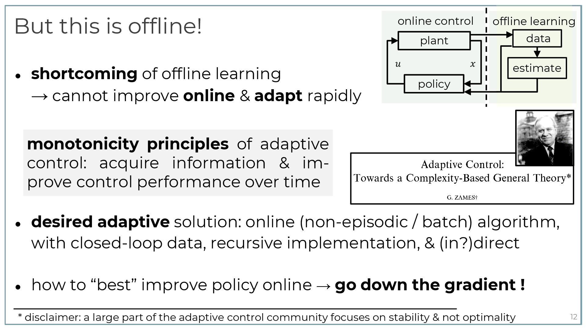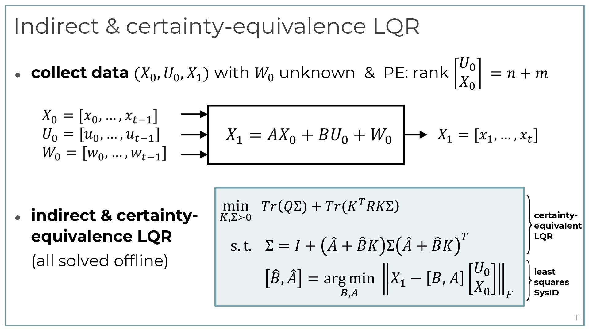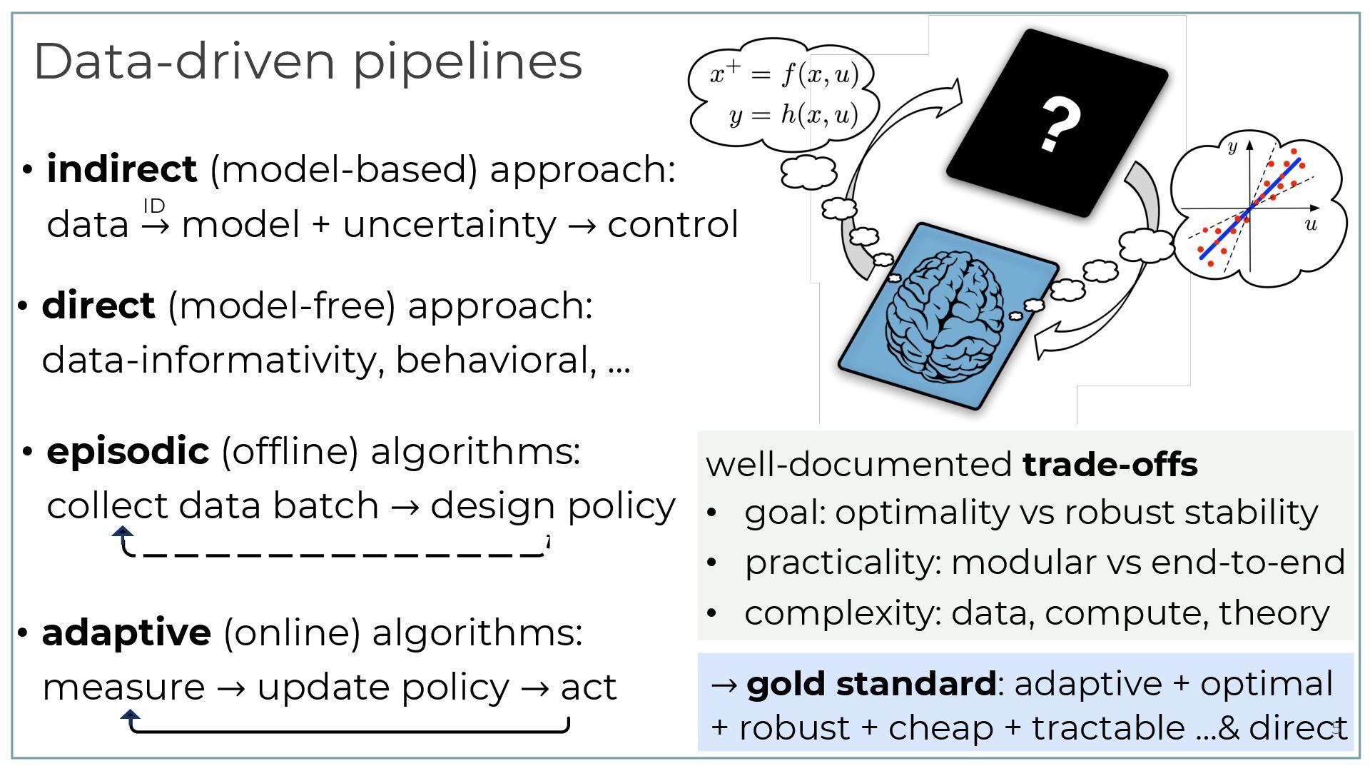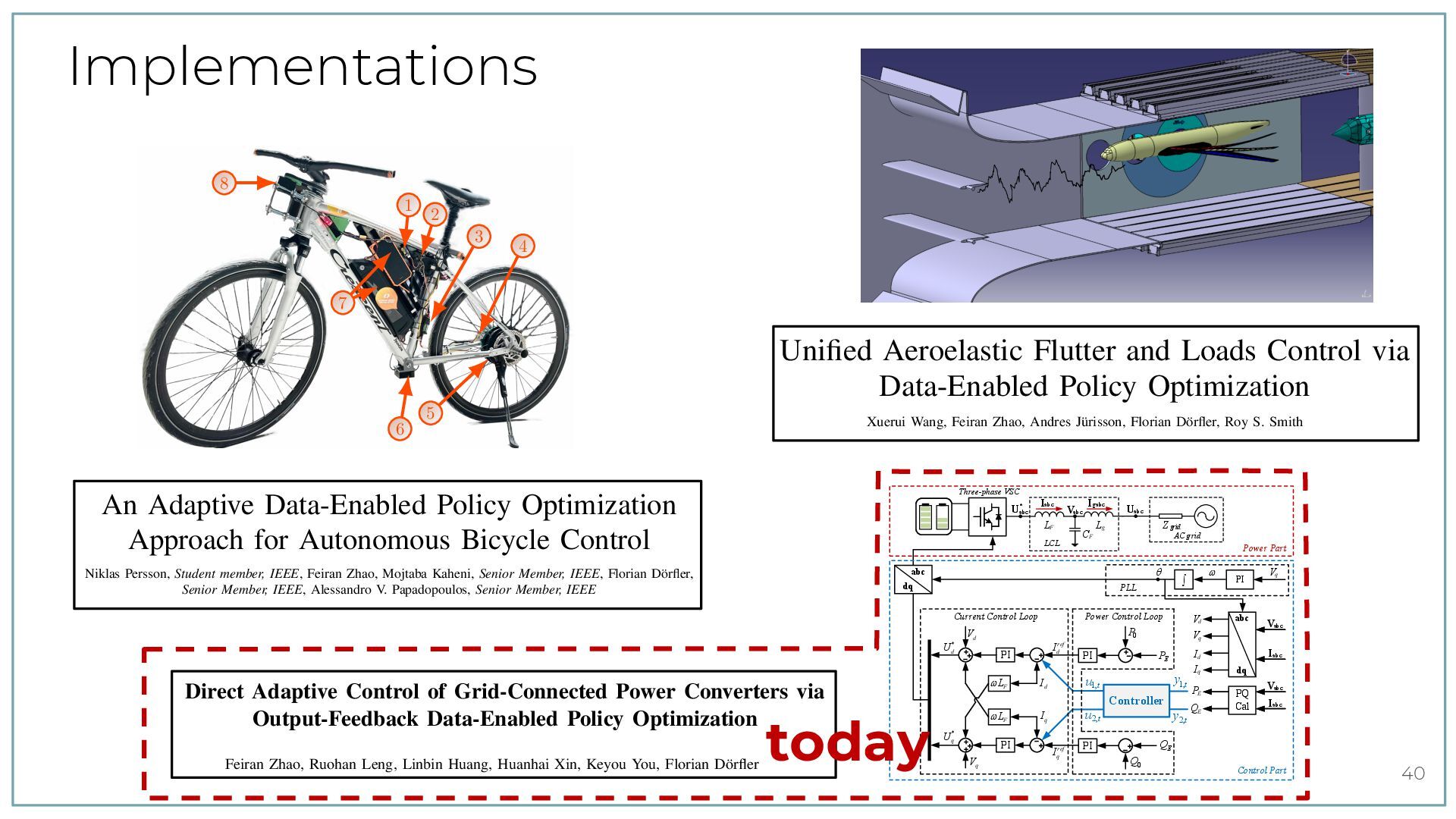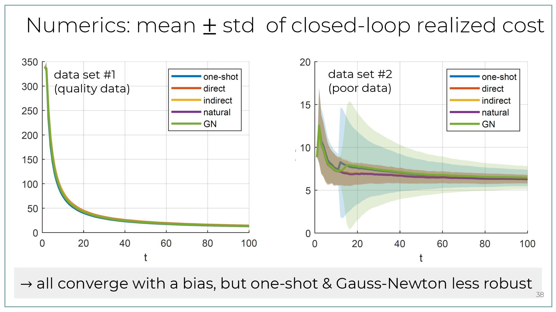 [email protected]>. Proceedings of the 37th International Conference on Machine Learning, Vienna, Austria, PMLR 119, 2020. Copyright 2020 by the author(s). Confidence-based exploration. Bittanti et al. (2006) intro- duced an adaptive control system based on the “bet on best” principle and proved asymptotic performance guarantees showing that their method would eventually converge to the optimal control. Abbasi-Yadkori & Szepesvári (2011) later proved a finite-time e O( p T) regret bound for OFU-LQ, later generalized to less restrictive stabilization and noise assumptions by Faradonbeh et al. (2017). Unfortunately, nei- ther exploration strategy comes with a computationally effi- cient algorithm to solve the optimistic LQR, and thus they cannot be directly implemented. On the TS side, Ouyang et al. (2017) proved a e O( p T) regret for the Bayesian regret, while Abeille & Lazaric (2018) showed that a similar bound holds in the frequentist case but restricted to 1-dimensional problems. While TS-based approaches require solving a single (random) LQR, the theoretical analysis of Abeille & Lazaric (2018) suggests that a new LQR instance should be solved at each time step, thus leading to a computational complexity growing linearly with the total number of steps. On the other hand, OFU-based methods allow for “lazy” updates, which require solving an optimistic LQR only a logarithmic number of times w.r.t. the total number of steps. A similar lazy-update scheme is used by Dean et al. (2018), who leveraged robust control theory to devise the first learn- ing algorithm with polynomial complexity and sublinear regret. Nonetheless, the resulting adaptive algorithm suffers from a e O(T2/3) regret, which is significantly worse than the e O( p T) achieved by OFU-LQ. To the best of our knowledge, the only efficient algorithm for confidence-based exploration with e O( p T) regret has been recently proposed by Cohen et al. (2019). Their method, called OSLO, leverages an SDP formulation of the LQ prob- lem, where an optimistic version of the constraints is used. As such, it translates the original non-convex OFU-LQ opti- mization problem into a convex SDP. While solving an SDP is known to have polynomial complexity, no explicit analysis is provided and it is said that the runtime may scale polyno- mially with LQ-specific parameters and the time horizon T (Cor. 5), suggesting that OSLO may become impractical for moderately large T. Furthermore, OSLO requires an initial system identification phase of length e O( p T) to properly initialize the method. This strong requirement effectively reduces OSLO to an explore-then-commit strategy, whose arXiv:2007.06482v1 [stat.ML] 13 Jul 2020 Harnessing Uncertainty for a Separation Principle in Direct Data-Driven Predictive Control ω Alessandro Chiuso a, Marco Fabris a, Valentina Breschi b, Simone Formentin c aDepartment of Information Engineering, University of Padova, Via Gradenigo 6/b, 35131 Padova, Italy. bDepartment of Electrical Engineering, Eindhoven University of Technology, 5600 MB Eindhoven, The Netherlands. cDipartimento di Elettronica, Informazione e Bioingegneria, Politecnico di Milano, P.za L. Da Vinci, 32, 20133 Milano, Italy. Abstract Model Predictive Control (MPC) is a powerful method for complex system regulation, but its reliance on an accurate model poses many limitations in real-world applications. Data-driven predictive control (DDPC) aims at overcoming this limitation, by relying on historical data to provide information on the plant to be controlled. In this work, we present a unified stochastic framework for direct DDPC, where control actions are obtained by optimizing the Final Control Error (FCE), which is directly computed from available data only and automatically weighs the impact of uncertainty on the control objective. Our framework allows us to establish a separation principle for Predictive Control, elucidating the role that predictive models and their uncertainty play in DDPC. Moreover, it generalizes existing DDPC methods, like regularized Data-enabled Predictive Control (DeePC) and ω-DDPC, providing a path toward noise-tolerant data-based control with rigorous optimality guarantees. The theoretical investigation is complemented by a series of experiments (code available on GitHub), revealing that the proposed method consistently outperforms or, at worst, matches existing techniques without requiring tuning regularization parameters as other methods do. Key words: data-driven predictive control, control of constrained systems, regularization, identification for control 1 Introduction Model Predictive Control (MPC) has earned recognition as a powerful technology for optimizing the regulation of complex systems, owing to its flexible formulation and constraint-handling capabilities [26]. However, its e!ec- tiveness is contingent on the accuracy of the predictor based on which control actions are optimized [6]. This native to traditional MPC, see [5,8,12]. DDPC directly maps data collected o”ine onto the control sequence starting from the current measurements, without the need for an intermediate identification phase. In the lin- ear time-invariant setting, mathematical tools such as the “fundamental lemma” [33] and linear algebra-based subspace and projection methods [32] represent the en- abling technology for data-driven control [8,15] also pro- Xiv:2312.14788v3 [eess.SY] 7 Jan 2025 Related to trajectory matrices, but • matrices independent of data size • uniqueness & no regularization • recursive rank-1 updates 1 Formulas for Data-driven Control: Stabilization, Optimality and Robustness C. De Persis and P. Tesi Abstract—In a paper by Willems and coauthors it was shown control theory [6], iterative feedback tuning [7], and virtual On the Certainty-Equivalence Approach to Direct Data-Driven LQR Design Florian D¨ orfler, Pietro Tesi, and Claudio De Persis Abstract—The linear quadratic regulator (LQR) problem 
