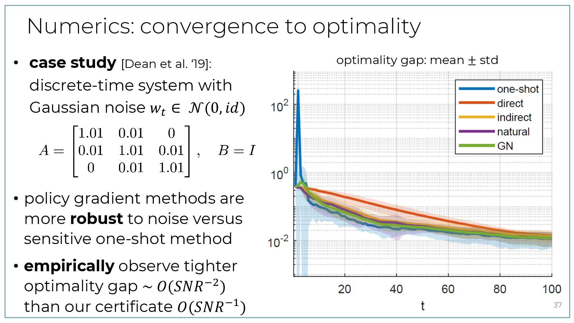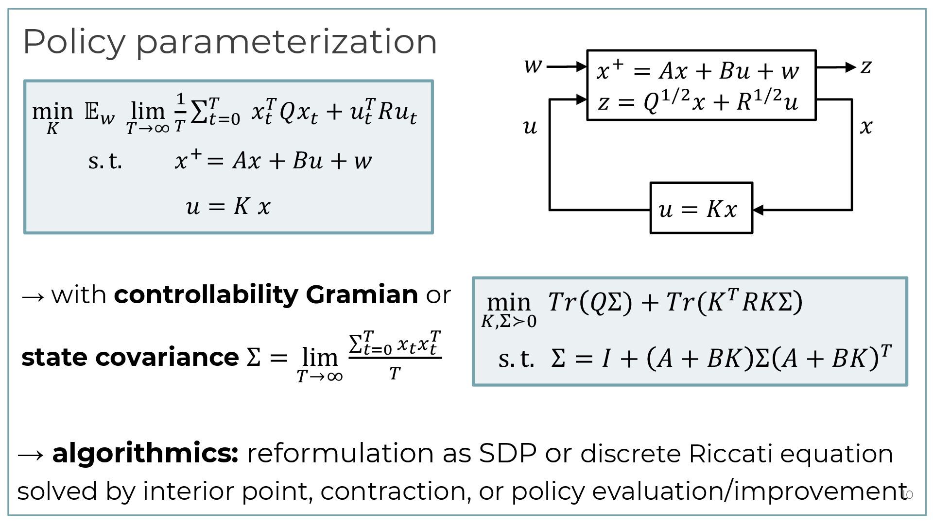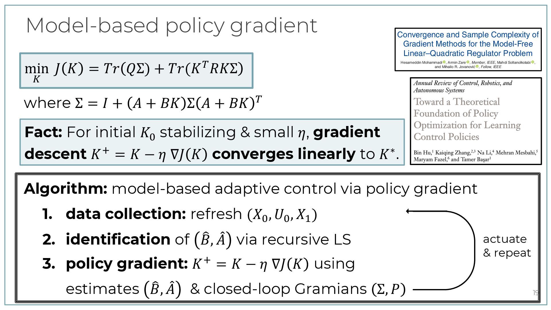 [email protected]>. Proceedings of the 35 th International Conference on Machine Learning, Stockholm, Sweden, PMLR 80, 2018. Copyright 2018 by the author(s). in the presence of time-varying energy costs, due to energy auctions or unexpected demand fluctuations. To measure how well a control system adapts to time-varying costs, it is common to consider the notion of regret: the di erence between the total cost of the controller, one that is only aware of previously observed costs, and that of the best fixed control policy in hindsight. This notion has been thoroughly studied in the context of online learning, and particularly in that of online convex optimization (Cesa-Bianchi & Lugosi, 2006; Hazan, 2016; Shalev-Shwartz, 2012). LQ control was considered in the context of regret by Abbasi-Yadkori et al. (2014), who give a learning algorithm for the problem of tracking an adversarially changing target in a system with noiseless linear dynamics. In this paper we consider online learning with fixed, known, linear dynamics and adversarially chosen quadratic cost matrices. Our main results are two online algorithm that achieve O( p T) regret, when comparing to any fast mixing linear policy.1 One of our algorithms is based on Online Gradient Descent (Zinkevich, 2003). The other is based on Follow the Lazy Leader (Kalai & Vempala, 2005), a variant of Follow the Perturbed Leader with only O( p T) expected number of policy switches. Overall, our approach follows Even-Dar et al. (2009). We first show how to perform online learning in an “idealized setting”, a hypothetical setting in which the learner can immediately observe the steady-state cost of any chosen control policy. We proceed to bound the gap between the idealized costs and the actual costs. Our technique is conceptually di erent to most learning problems: instead of predicting a policy and observing its steady-state cost, the learner predicts a steady-state distri- bution and derives from it a corresponding policy. Impor- tantly, this view allows us to cast the idealized problem as a semidefinite program which minimizes the expected costs as a function of a steady state distribution (of both states and controls). As the problem is now convex, we apply OGD and FLL to the SDP and argue about fast-mixing properties of its feasible solutions. 1 Technically, we define the class of “strongly stable” policies that guarantee the desired fast mixing property. Conceptually, slowly mixing policies are less attractive for implementation, given their inherent gap between their long and short term cost. 25