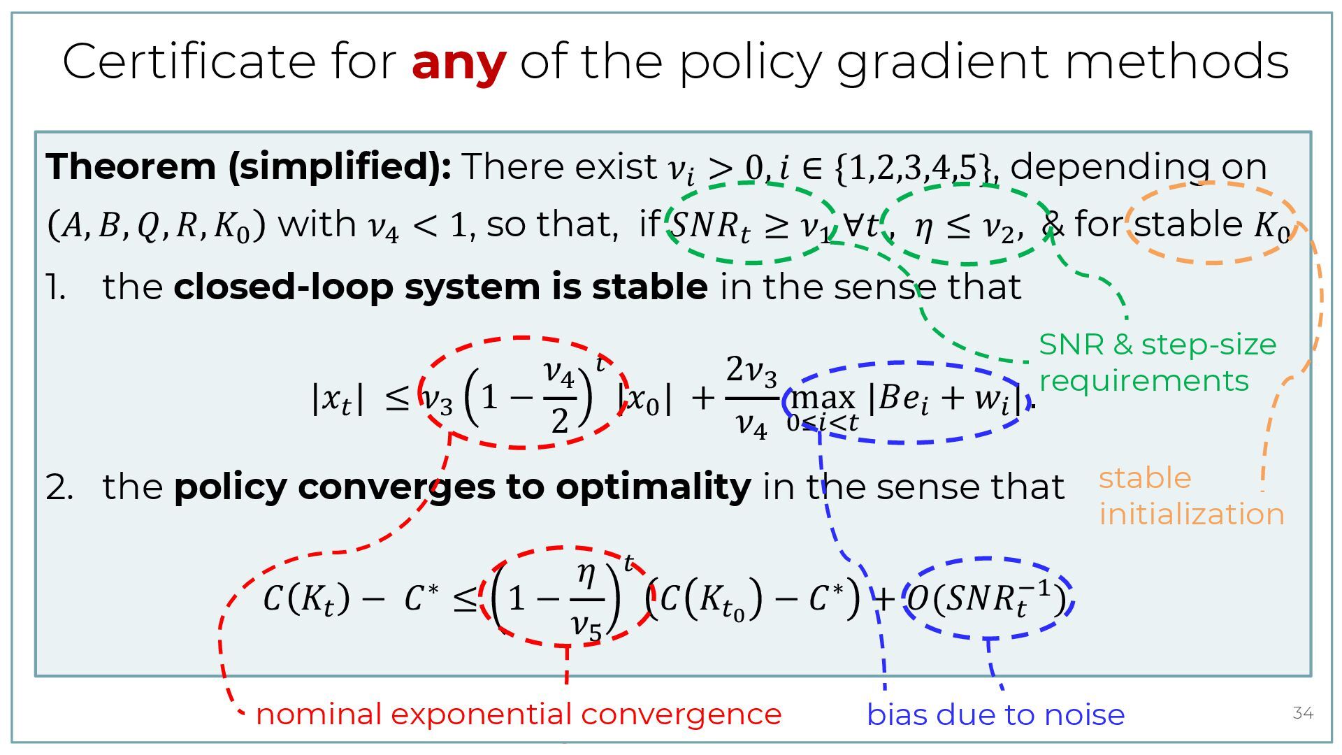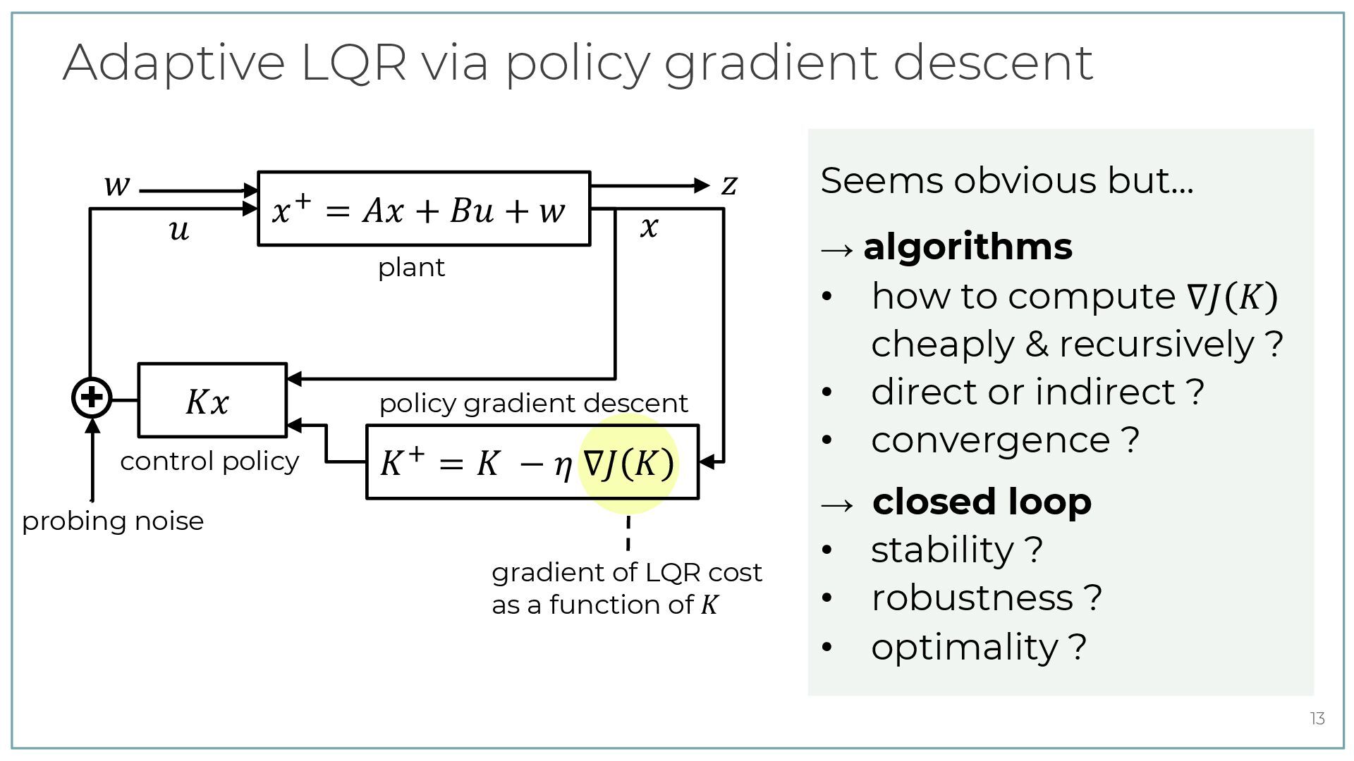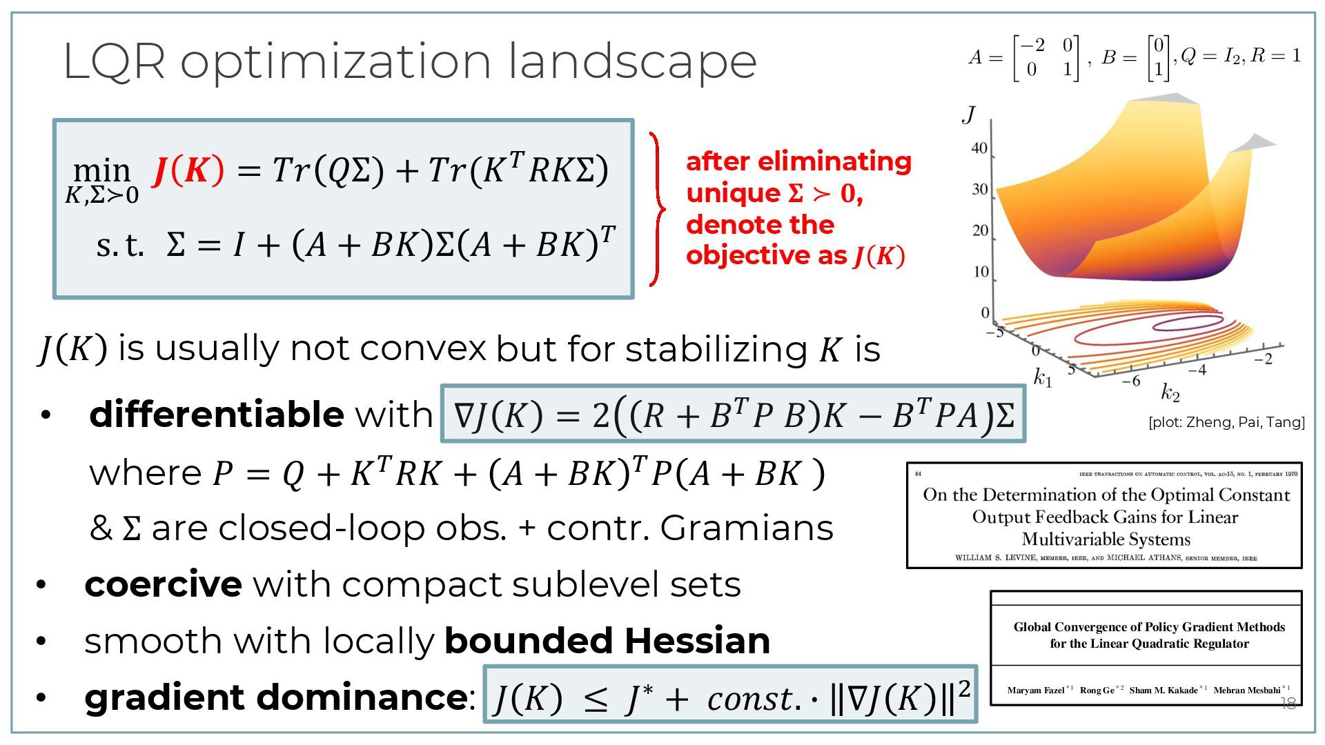 [email protected]>. Proceedings of the 35 th International Conference on Machine Learning, Stockholm, Sweden, PMLR 80, 2018. Copyright 2018 by the author(s). in the presence of time-varying energy costs, due to energy auctions or unexpected demand fluctuations. To measure how well a control system adapts to time-varying costs, it is common to consider the notion of regret: the di erence between the total cost of the controller, one that is only aware of previously observed costs, and that of the best fixed control policy in hindsight. This notion has been thoroughly studied in the context of online learning, and particularly in that of online convex optimization (Cesa-Bianchi & Lugosi, 2006; Hazan, 2016; Shalev-Shwartz, 2012). LQ control was considered in the context of regret by Abbasi-Yadkori et al. (2014), who give a learning algorithm for the problem of tracking an adversarially changing target in a system with noiseless linear dynamics. In this paper we consider online learning with fixed, known, linear dynamics and adversarially chosen quadratic cost matrices. Our main results are two online algorithm that achieve O( p T) regret, when comparing to any fast mixing linear policy.1 One of our algorithms is based on Online Gradient Descent (Zinkevich, 2003). The other is based on Follow the Lazy Leader (Kalai & Vempala, 2005), a variant of Follow the Perturbed Leader with only O( p T) expected number of policy switches. Overall, our approach follows Even-Dar et al. (2009). We first show how to perform online learning in an “idealized setting”, a hypothetical setting in which the learner can immediately observe the steady-state cost of any chosen control policy. We proceed to bound the gap between the idealized costs and the actual costs. Our technique is conceptually di erent to most learning problems: instead of predicting a policy and observing its steady-state cost, the learner predicts a steady-state distri- bution and derives from it a corresponding policy. Impor- tantly, this view allows us to cast the idealized problem as a semidefinite program which minimizes the expected costs as a function of a steady state distribution (of both states and controls). As the problem is now convex, we apply OGD and FLL to the SDP and argue about fast-mixing properties of its feasible solutions. 1 Technically, we define the class of “strongly stable” policies that guarantee the desired fast mixing property. Conceptually, slowly mixing policies are less attractive for implementation, given their inherent gap between their long and short term cost. 25