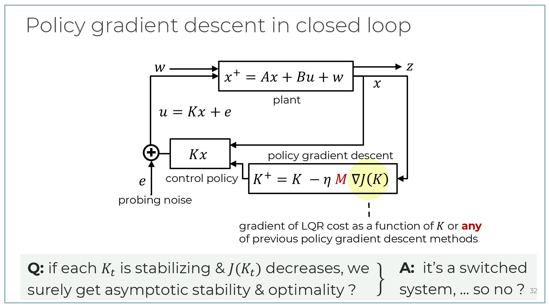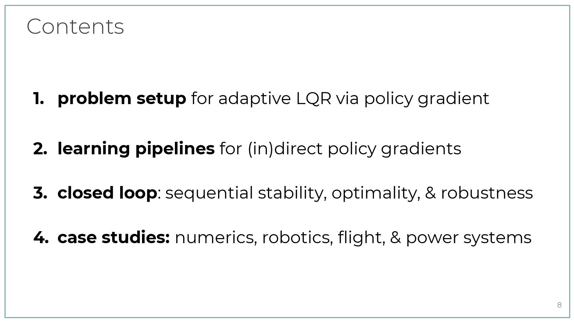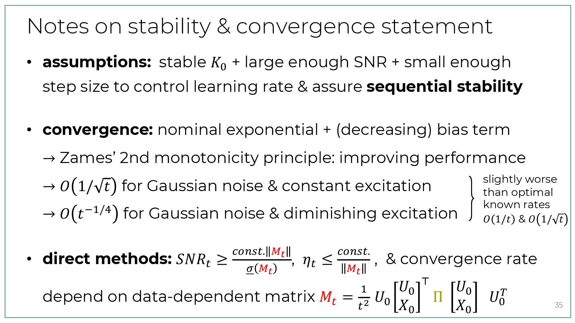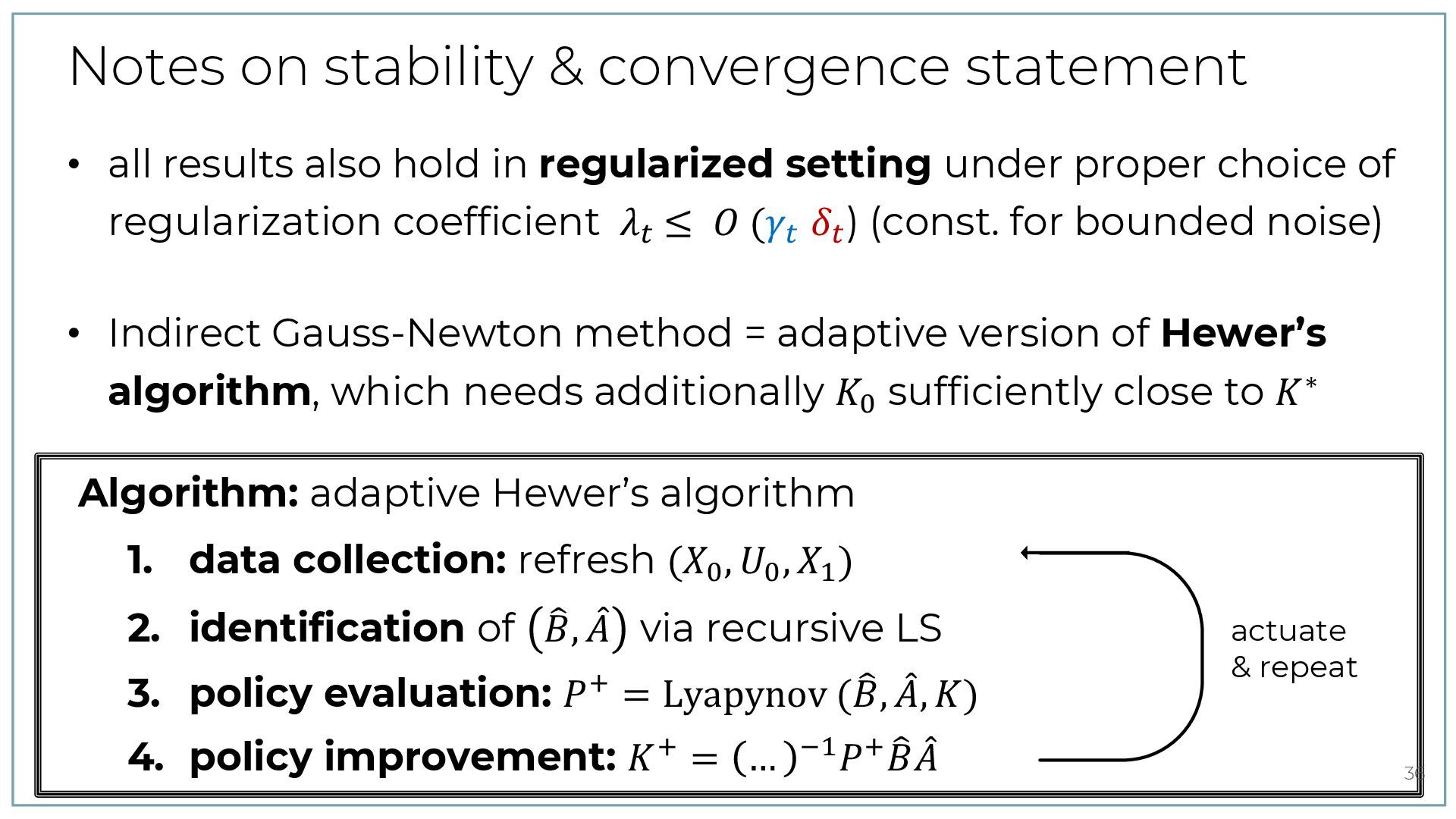 [email protected] Lund University, Sweden Abstract Certainty equivalence adaptive controllers are analysed using a “data-driven Riccati equation”, cor- responding to the model-free Bellman equation used in Q-learning. The equation depends quadrat- ically on data correlation matrices. This makes it possible to derive simple sufficient conditions for stability and robustness to unmodeled dynamics in adaptive systems. The paper is concluded by short remarks on how the bounds can be used to quantify the interplay between excitation levels and robustness to unmodeled dynamics. Keywords: dual control, adaptive control, online learning, linear quadratic control 1. Introduction The history of adaptive control dates back at least to aircraft autopilot development in the 1950s. Following the landmark paper ˚ Astr¨ om and Wittenmark (1973), a surge of research activity during the 1970s derived conditions for convergence, stability, robustness and performance under various assumptions. For example, Ljung (1977) analysed adaptive algorithms using averaging, Goodwin et al. (1981) derived an algorithm that gives mean square stability with probability one, while Guo (1995) gave conditions for the optimal asymptotic rate of convergence. On the other hand, condi- tions that may cause instability were studied in Egardt (1979), Ioannou and Kokotovic (1984) and Rohrs et al. (1985). Altogether, the subject has a rich history documented in numerous textbooks, such as ˚ Astr¨ om and Wittenmark (2013), Goodwin and Sin (2014), and Sastry and Bodson (2011). Recently, there has been a renewed interest in analysis of adaptive controllers, driven by progress in statistical machine learning. See Tsiamis et al. (2023) for a review. In parallel, there is also a rapidly developing literature on (off-line) data-driven control. De Persis and Tesi (2019); Markovsky and D¨ orfler (2021); Berberich et al. (2020). In this paper, the focus is on worst-case models for disturbances and uncertain parameters, as discussed in Cusumano and Poolla (1988); Sun and Ioannou (1987); Vinnicombe (2004); Megretski (2004) and more recently in Rantzer (2021); Cederberg et al. (2022); Kjellqvist and Rantzer (2022). However, the disturbances in this paper are assumend to be bounded in terms of past states and inputs. This causality constraint is different from above mentioned references. 2. Notation Regularization for Covariance Parameterization of Direct Data-Driven LQR Control Feiran Zhao, Alessandro Chiuso, Florian D¨ orfler Abstract— As the benchmark of data-driven control methods, the linear quadratic regulator (LQR) problem has gained significant attention. A growing trend is direct LQR design, which finds the optimal LQR gain directly from raw data and bypassing system identification. To achieve this, our previous work develops a direct LQR formulation parameterized by sample covariance. In this paper, we propose a regulariza- tion method for the covariance-parameterized LQR. We show that the regularizer accounts for the uncertainty in both the steady-state covariance matrix corresponding to closed- loop stability, and the LQR cost function corresponding to averaged control performance. With a positive or negative coefficient, the regularizer can be interpreted as promoting either exploitation or exploration, which are well-known trade- offs in reinforcement learning. In simulations, we observe that our covariance-parameterized LQR with regularization can significantly outperform the certainty-equivalence LQR in terms of both the optimality gap and the robust closed-loop stability. I. INTRODUCTION As a cornerstone of modern control theory, the linear quadratic regulator (LQR) has become the benchmark prob- lem of validating and comparing different data-driven control methods [1]. Manifold approaches to data-driven LQR design can be broadly classified as indirect, i.e., based on system identification (SysID) followed by model-based control, ver- relations, the closed-loop matrix can be further expressed by raw data matrices. As such, the LQR problem can be reformulated as a data-based convex program parameterized and solved without involving any explicit SysID. In this direct LQR framework, regularization can be used to single out a solution with favorable properties [2], [12], [13]. By selecting proper regularization coefficients, the solution can flexibly interpolate between indirect certainty-equivalence LQR and robust closed-loop stable gains. While the parameterization and regularization in [2], [12], [13] sheds a light on direct LQR design, two limitations hinder their broader implication. First, the dimension of their direct LQR formulation scales linearly with the data length. Thus, this parameterization cannot be used to achieve adaptive control with online closed-loop data [14]. Second, their direct LQR solution without regularization is sensitive to noise [15]. Even using regularization, there is a trade- off between performance and robust closed-loop stability in their solution, i.e., one has to be sacrificed to gain the other [13]. Moreover, when the length of data tends to infinity, the regularized formulation may lead to trivial solutions [15]. To address the first limitation, our previous work [14] proposes a new parameterization for the direct data-driven LQR, which parameterizes the feedback gain as a linear 985v1 [eess.SY] 4 Mar 2025 Gaussian behaviors: representations and data-driven control Andr´ as Sasfi, Ivan Markovsky, Alberto Padoan, Florian D¨ orfler Abstract— We propose a modeling framework for stochastic systems based on Gaussian processes. Finite-length trajectories of the system are modeled as random vectors from a Gaussian distribution, which we call a Gaussian behavior. The proposed model naturally quantifies the uncertainty in the trajectories, yet it is simple enough to allow for tractable formulations. We relate the proposed model to existing descriptions of dynamical systems including det