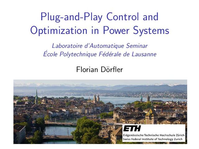 algorithm Theorem: optimal droop [FD, Simpson-Porco, & Bullo ’13, Zhao, Mallada, & FD ’14] The following statements are equivalent: (i) the economic dispatch with cost coefficients αi is strictly feasible with global minimizer (θ , u ). (ii) ∃ droop coefficients Di such that the power system possesses a unique & locally exp. stable sync’d solution θ. If (i) & (ii) are true, then θi ∼θ i , ui =−Di (ωsync −ω∗), & Di αi = Dj αj . similar results for non-quadratic (strictly convex) cost & constraints similar results in transmission ntwks with DC flow [E. Mallada & S. Low, ’13] & [N. Li, L. Chen, C. Zhao, & S. Low ’13] & [X. Zhang & A. Papachristodoulou, ’13] & [M. Andreasson, D. V. Dimarogonas, K. H. Johansson, & H. Sandberg, ’13] & . . . 14 / 32