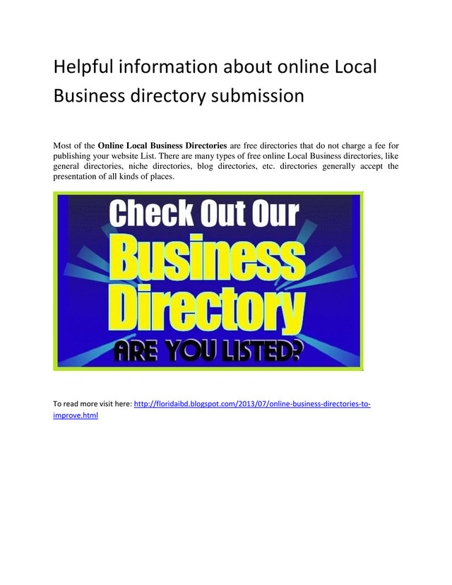 the Online Local Business Directories are free directories that do not charge a fee for publishing your website List. There are many types of free online Local Business directories, like general directories, niche directories, blog directories, etc. directories generally accept the presentation of all kinds of places. To read more visit here: http://floridaibd.blogspot.com/2013/07/online-business-directories-to- improve.html