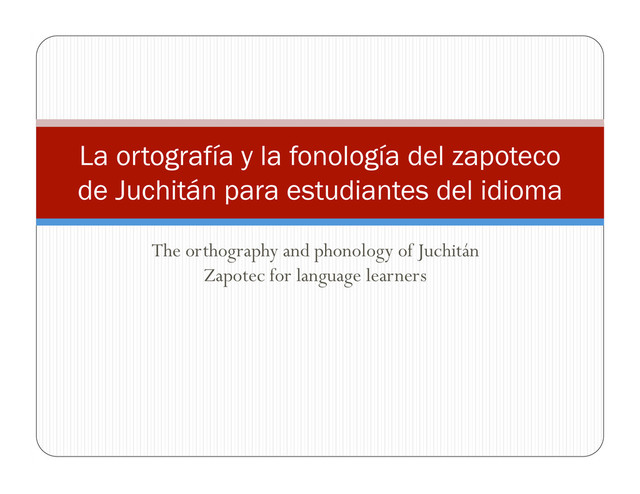 An overview of the writing system and the sounds of Juchitán Zapotec for people interested in studying the language. Download a chart of the International Phonetic Alphabet for help with some of the sounds. In English and Spanish.
