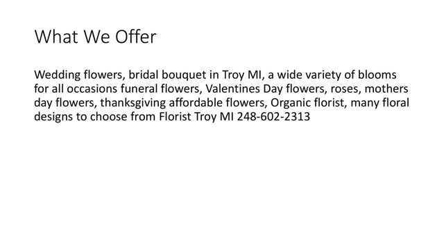 we offer a wide variety of flowers in Troy MI Wedding flowers, bridal bouquet in Troy MI, a wide variety of blooms for all occasions funeral flowers, Valentines Day flowers, roses, mothers day flowers, thanksgiving affordable flowers, Organic florist, many floral designs to choose from Florist Troy MI 248-602-2313