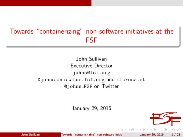 percent) by grassroots contributions from thousands of individual members. Join the FSF at fsf.org/join. Or donate what you can at donate.fsf.org. Take our Vision Survey at fsf.org/survey Stay informed by subscribing to our Free Software Supporter newsletter at fsf.org/fss. It’s also available in Spanish and French. Ask your employer to support us. Come to LibrePlanet! (March 19-20 in Cambridge, MA) libreplanet.org/conference Slides will be available at https://libreplanet.org/wiki/User:Johns/Presentations. John Sullivan Towards “containerizing” non-software initiatives at the FSF January 29, 2016 21 / 21