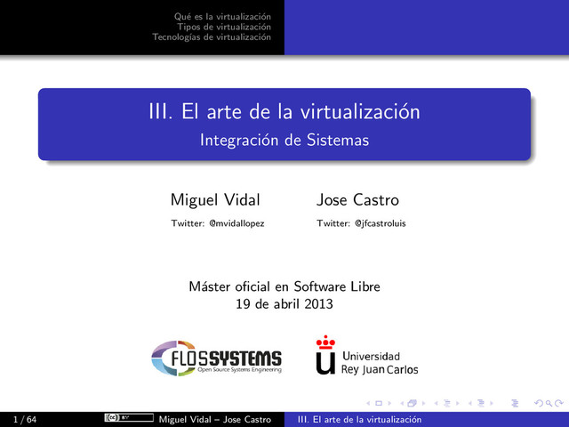 Tecnolog´ ıas de virtualizaci´ on III. El arte de la virtualizaci´ on Integraci´ on de Sistemas Miguel Vidal Jose Castro Twitter: @mvidallopez Twitter: @jfcastroluis M´ aster oficial en Software Libre 19 de abril 2013 1 / 64 Miguel Vidal – Jose Castro III. El arte de la virtualizaci´ on