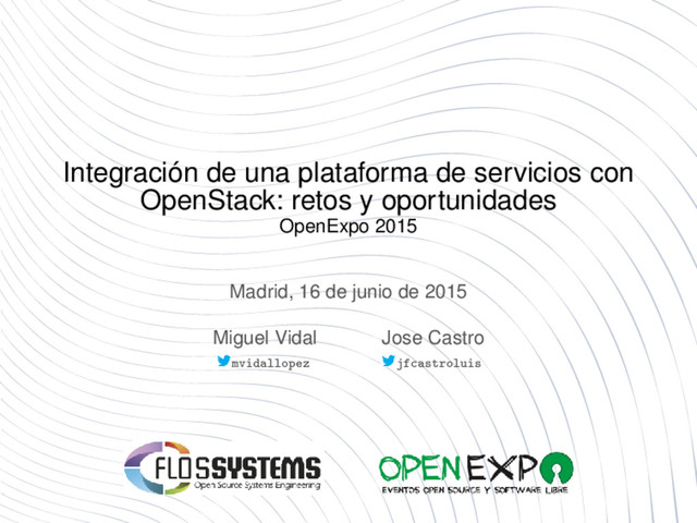 de OpenStack Retos y oportunidades con OpenStack Por qué no clouds públicos (privativos) Arquitectura de FLOSSystems Preguntas Demo FLOSSystems S.L., Madrid, Spain Licencia c 2015 FLOSSystems S.L. Esta presentación se publica bajo la licencia Creative Commons Reconocimiento 3.0 España http://creativecommons.org/licenses/by/3.0/es