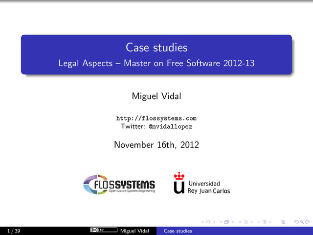 Intellectual Property: basic concepts and legal framework Lesson 2: Legal Aspects of Free/Open Source Software Lesson 3: Free/Open Source software licenses Lesson 4: Free licenses for other intellectual works Lesson 5: Case studies 4 / 39 Miguel Vidal Case studies