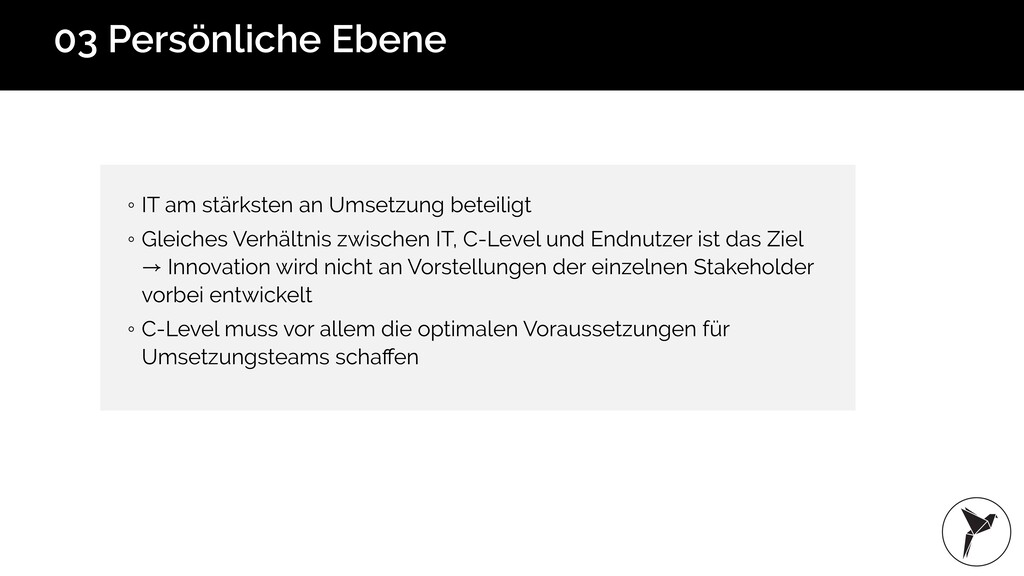 ◦ Gleiches Verhältnis zwischen IT, C-Level und Endnutzer ist das Ziel → Innovation wird nicht an Vorstellungen der einzelnen Stakeholder vorbei entwickelt ◦ C-Level muss vor allem die optimalen Voraussetzungen für Umsetzungsteams schaffen