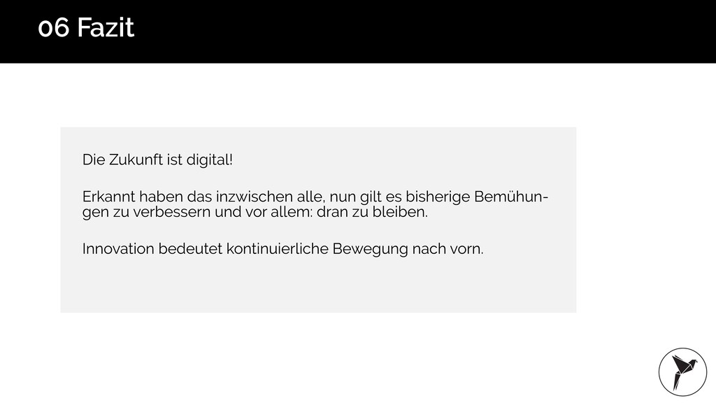 Innovation Hubs und Digital Units, um intern digitale Innovation voran zu treiben ◦ Wenn Kompetenzen fehlen, wird auf externe Berater zurückgegriffen ◦ Weitere Lösung: End-to-End-Dienstleister, der sich an Strukturen des Unternehmens anpasst → durch enge Zusammenarbeit ist Weiterentwicklung im Unternehmen möglich