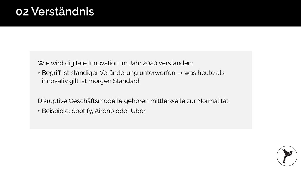 ◦ Begriff ist ständiger Veränderung unterworfen → was heute als innovativ gilt ist morgen Standard Disruptive Geschäftsmodelle gehören mittlerweile zur Normalität: ◦ Beispiele: Spotify, Airbnb oder Uber