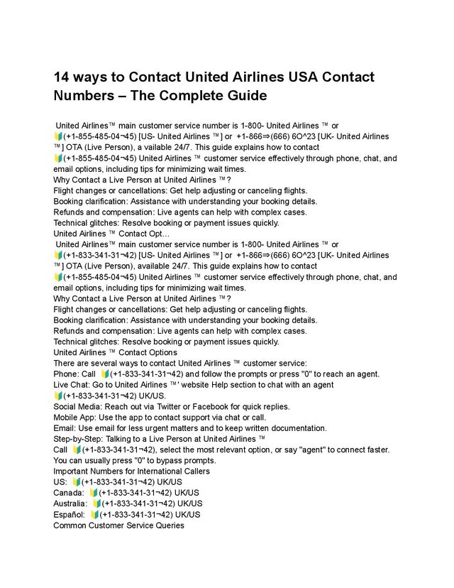 The Complete Guide United Airlines™️ main customer service number is 1-800- United Airlines ™️ or 🔰(+1-855-485-04¬45) [US- United Airlines ™️] or +1-866⇒(666) 6O^23 [UK- United Airlines ™️] OTA (Live Person), a vailable 24/7. This guide explains how to contact 🔰(+1-855-485-04¬45) United Airlines ™️ customer service effectively through phone, chat, and email options, including tips for minimizing wait times. Why Contact a Live Person at United Airlines ™️? Flight changes or cancellations: Get help adjusting or canceling flights. Booking clarification: Assistance with understanding your booking details. Refunds and compensation: Live agents can help with complex cases. Technical glitches: Resolve booking or payment issues quickly. United Airlines ™️ Contact Opt… United Airlines™️ main customer service number is 1-800- United Airlines ™️ or 🔰(+1-833-341-31¬42) [US- United Airlines ™️] or +1-866⇒(666) 6O^23 [UK- United Airlines ™️] OTA (Live Person), available 24/7. This guide explains how to contact 🔰(+1-855-485-04¬45) United Airlines ™️ customer service effectively through phone, chat, and email options, including tips for minimizing wait times. Why Contact a Live Person at United Airlines ™️? Flight changes or cancellations: Get help adjusting or canceling flights. Booking clarification: Assistance with understanding your booking details. Refunds and compensation: Live agents can help with complex cases. Technical glitches: Resolve booking or payment issues quickly. United Airlines ™️ Contact Options There are several ways to contact United Airlines ™️ customer service: Phone: Call 🔰(+1-833-341-31¬42) and follow the prompts or press "0" to reach an agent. Live Chat: Go to United Airlines ™️' website Help section to chat with an agent 🔰(+1-833-341-31¬42) UK/US. Social Media: Reach out via Twitter or Facebook for quick replies. Mobile App: Use the app to contact support via chat or call. Email: Use email for less urgent matters and to keep written documentation. Step-by-Step: Talking to a Live Person at United Airlines ™️ Call 🔰(+1-833-341-31¬42), select the most relevant option, or say "agent" to connect faster. You can usually press "0" to bypass prompts. Important Numbers for International Callers US: 🔰(+1-833-341-31¬42) UK/US Canada: 🔰(+1-833-341-31¬42) UK/US Australia: 🔰(+1-833-341-31¬42) UK/US Español: 🔰(+1-833-341-31¬42) UK/US Common Customer Service Queries