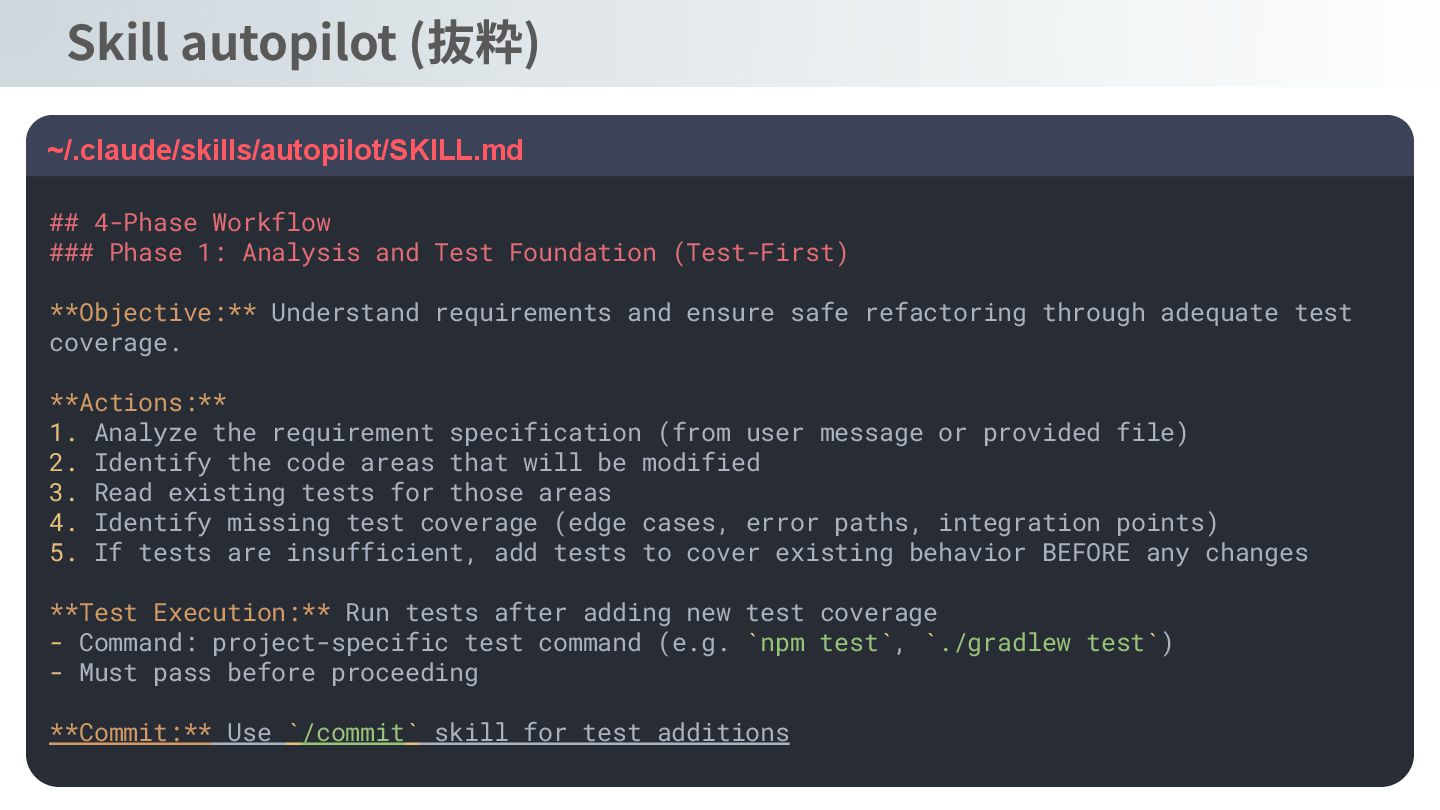 and Test Foundation (Test-First) **Objective:** Understand requirements and ensure safe refactoring through adequate test coverage. **Actions:** 1. Analyze the requirement specification (from user message or provided file) 2. Identify the code areas that will be modified 3. Read existing tests for those areas 4. Identify missing test coverage (edge cases, error paths, integration points) 5. If tests are insufficient, add tests to cover existing behavior BEFORE any changes **Test Execution:** Run tests after adding new test coverage - Command: project-specific test command (e.g. `npm test`, `./gradlew test`) - Must pass before proceeding **Commit:** Use `/commit` skill for test additions ~/.claude/skills/autopilot/SKILL.md