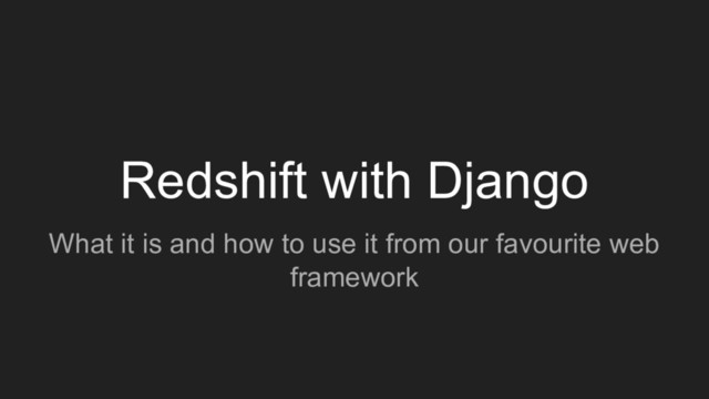 app on Redshift (low performance) - Use Django ORM on Redshift (common ops have low performance) - Use Django migrations on Redshift (types are slightly different) - Columns are NULLable by default - Optimize it (or change tables) like you would on Postgresql