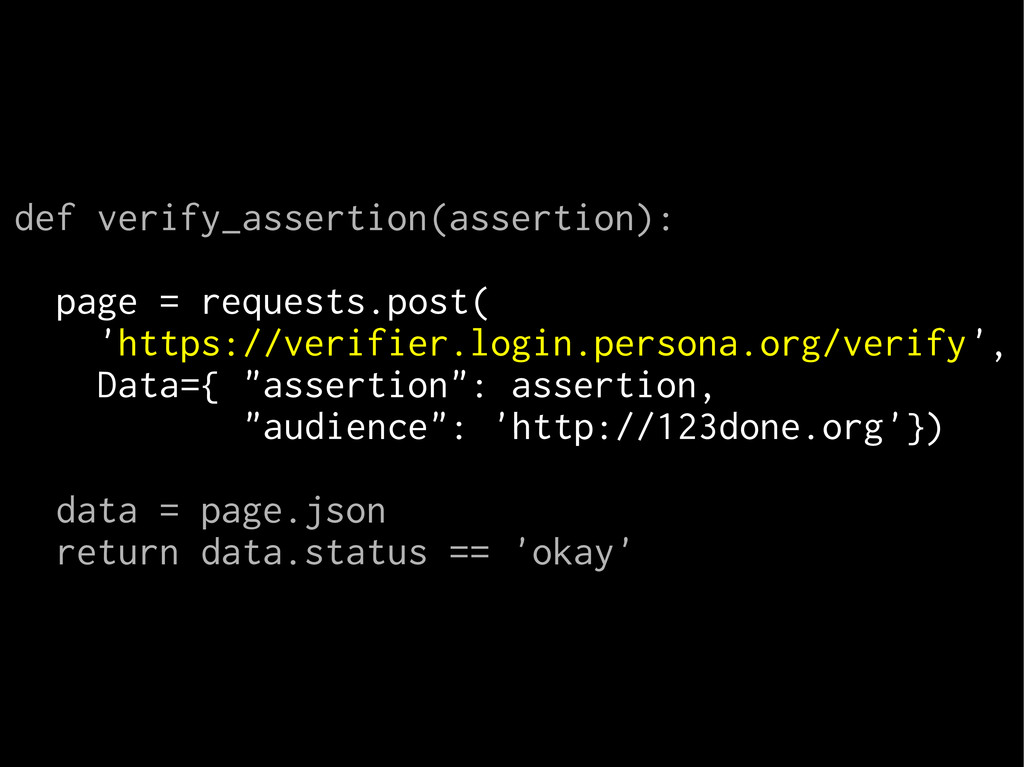 'okay') { print_header(); echo "<p>Logged in as: " . $result->email . "</p>"; echo '<p><a href="javascript:do_logout()">Logout</a></p>'; print_backLink(); print_footer($result->email); } else { print_header(); echo "<p>Error: " . $result->reason . "</p>"; print_backLink(); print_footer(); } } elseif (!empty($_GET['logout'])) { print_header(); echo "<p>You have logged out.</p>"; print_backLink(); print_footer(); } else { print_header(); echo "<p><a href=\"javascript:do_login()\">Login</a></p>"; print_footer(); } function print_header() { echo <<<EOF <!DOCTYPE html><html><head><meta charset="utf-8"></head> <body> <form id="login-form" method="POST"> <input id="assertion-field" type="hidden" name="assertion" value=""> </form> EOF; } function print_backLink() { echo "<p><a href=\"persona.php\">Back to login page</a></p>"; } function print_footer($email = 'null') { if ($email !== 'null') { $email = "'$email'"; } echo <<<EOF <script src="http://127.0.0.1:10002/include.orig.js"></script> <script> function do_login() { navigator.id.request(); } function do_logout() { navigator.id.logout(); } navigator.id.watch({ loggedInUser: $email, onlogin: function (assertion) { alert("onlogin: $email"); var assertion_field = document.getElementById("assertion-field"); assertion_field.value = assertion; var login_form = document.getElementById("login-form"); login_form.submit(); }, onlogout: function () { alert("onlogout: $email"); window.location = '?logout=1'; } }); </script></body></html> EOF; } function verify_assertion($assertion) { $audience = ($_SERVER['HTTPS'] === 'on' ? 'https://' : 'http://') . $_SERVER['SERVER_NAME'] . ':' . $_SERVER['SERVER_PORT']; $postdata = 'assertion=' . urlencode($assertion) . '&audience=' . urlencode($audience); $ch = curl_init(); curl_setopt($ch, CURLOPT_URL, "https://verifier.login.persona.org/verify"); curl_setopt($ch, CURLOPT_POST, true); curl_setopt($ch, CURLOPT_RETURNTRANSFER, true); curl_setopt($ch, CURLOPT_POSTFIELDS, $postdata); curl_setopt($ch, CURLOPT_SSL_VERIFYPEER, true); curl_setopt($ch, CURLOPT_SSL_VERIFYHOST, 2); $json = curl_exec($ch); curl_close($ch); $res = json_decode($json); $res->status = 'okay'; $res->email = '[email protected]'; return $res; } ?>