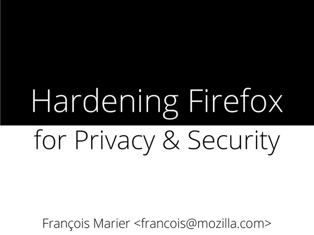 This talk will examine some of the hidden or advanced settings and extensions that Firefox offers to users who are concerned about their security and privacy. While we at Mozilla strive to bring these features to all of our users, the reality is that it's sometimes challenging to balance the need for maximum web compatibility and standards compliance with the desire to phase out harmful practices. With a little bit of context on the benefits and risks that some of these features provide, you should be able to make informed decisions and tweak your favorite user agent.