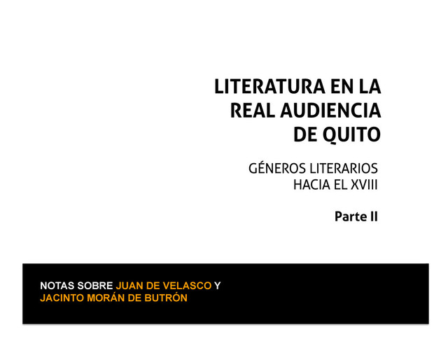 Maldonado, como muestra del espíritu científico. • Jacinto Morán de Butrón, Antonio Alcedo y Pedro Franco Dávila, como muestra de los primeros intentos de biografía, bibliografía y clasificación naturalista. • Tampoco hay que olvidar, a pesar de la polémica en torno a su obra, al jesuita riobambeño Juan de Velasco. En el XVIII también destacan ...