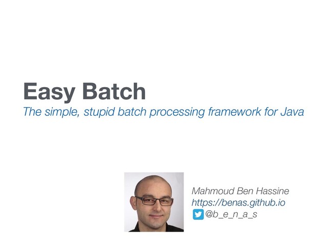 Batch? • Why does Easy Batch not persist job state in a database like Spring Batch? • Why does Easy Batch not provide a Step concept like Spring Batch?