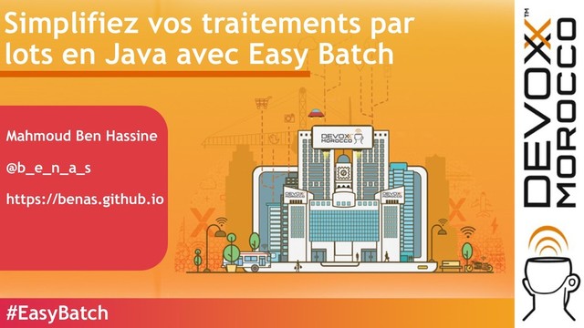 FlatFileRecord, XmlRecord, JsonRecord, JdbcRecord, JmsRecord, etc.. Record.java public interface Record<P> { /** Header of the record */ Header getHeader(); /** Payload of the record */ P getPayload(); } #EasyBatch 10 @b_e_n_a_s