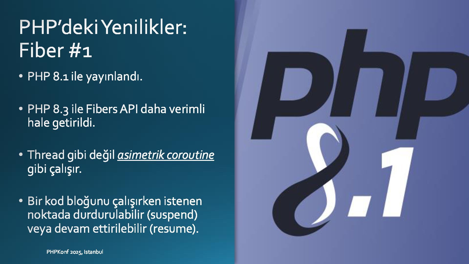 The session covers Fibers, introduced in PHP 8.1 and improved in later versions, which serve as the underlying mechanism for lightweight, controllable async flows. While not full async on their own, Fibers play a key role in userland coroutine implementations.