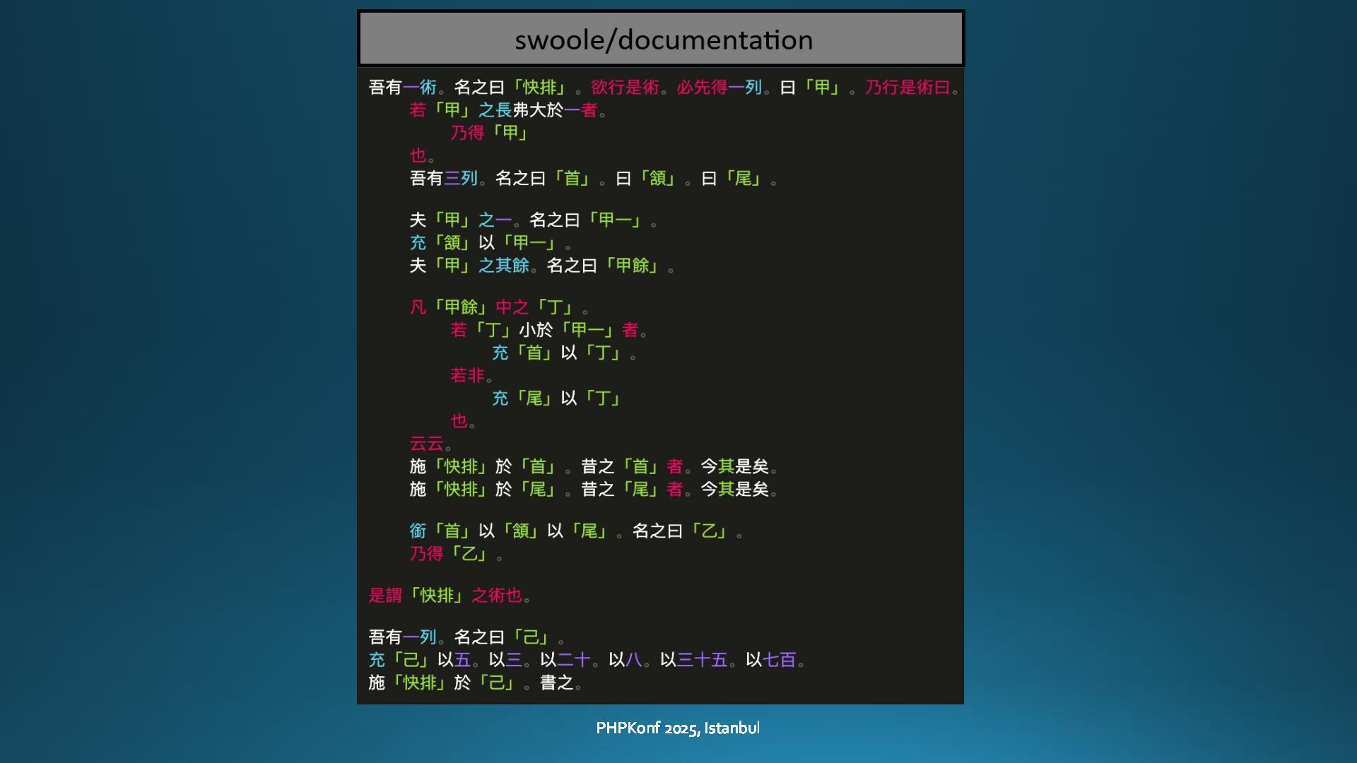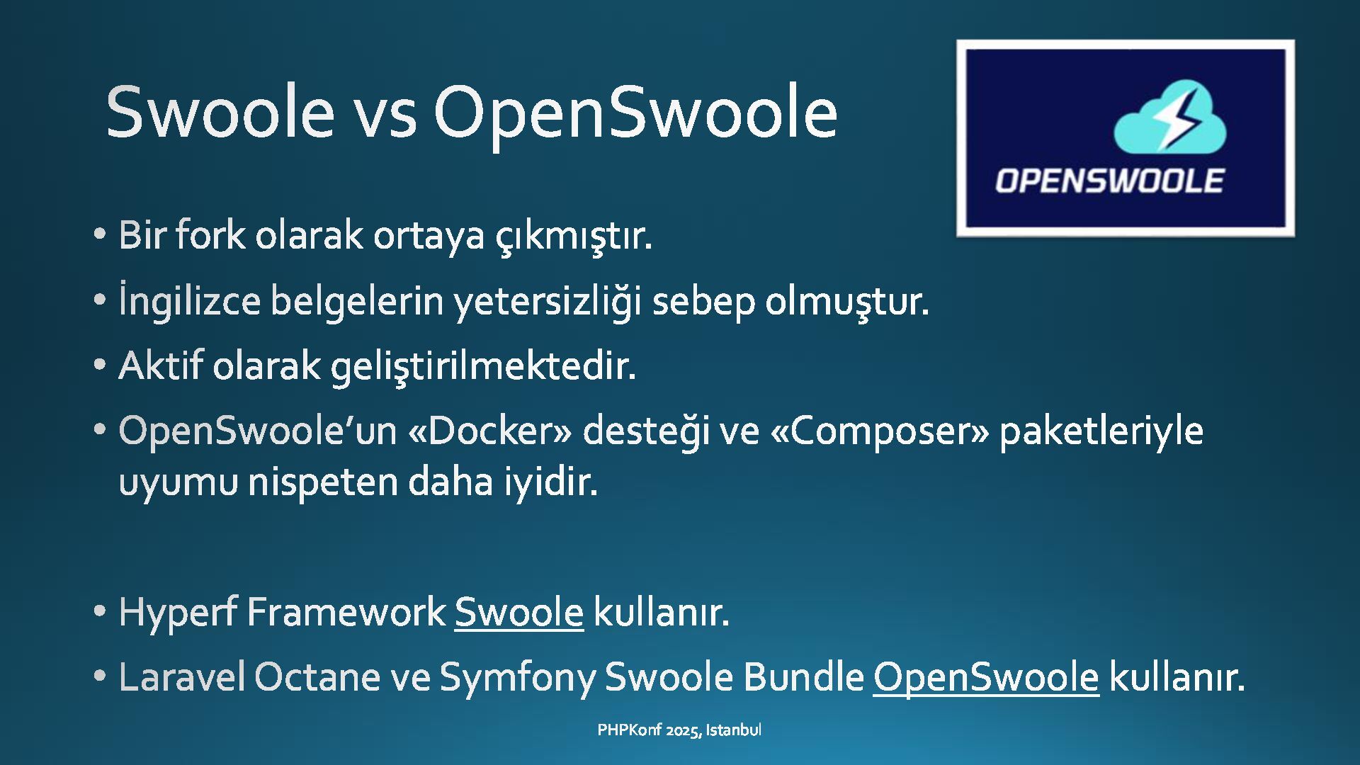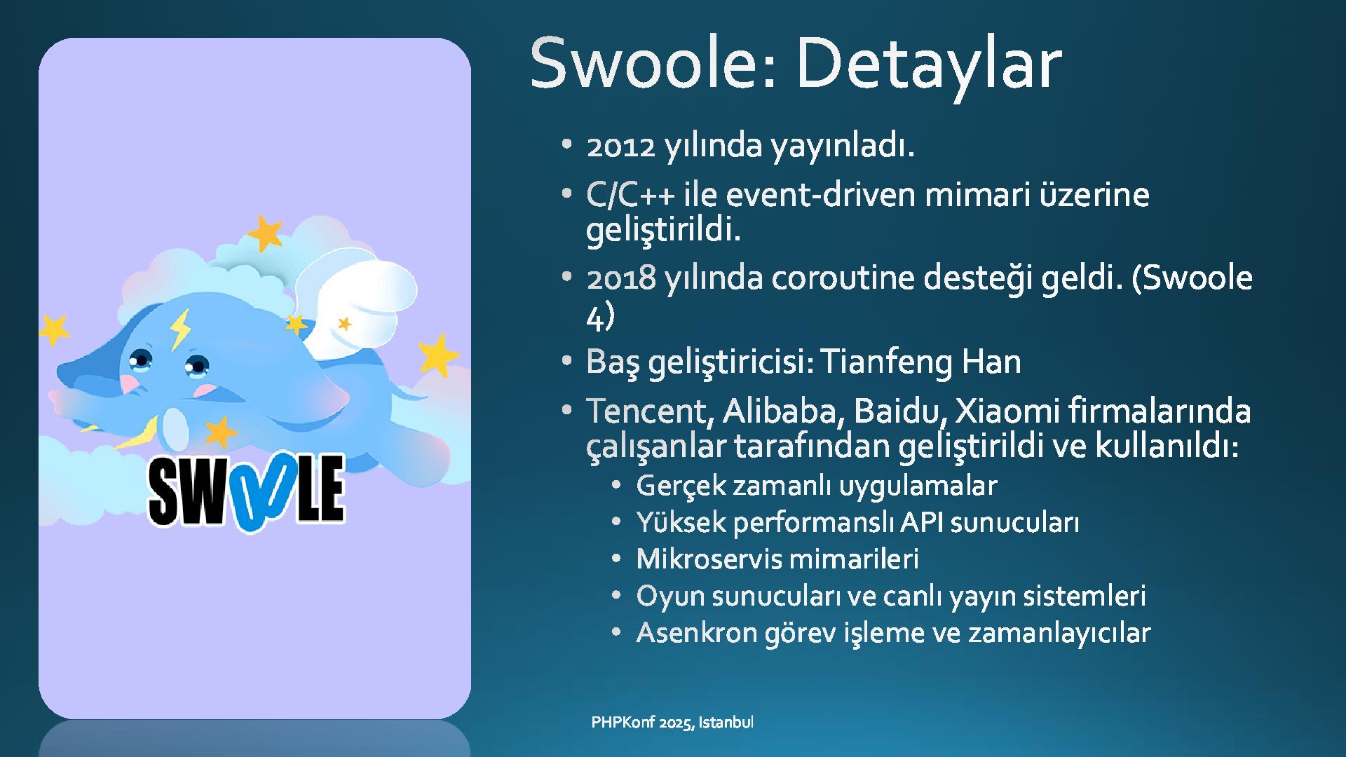 - A large portion of the presentation focuses on Swoole, including: