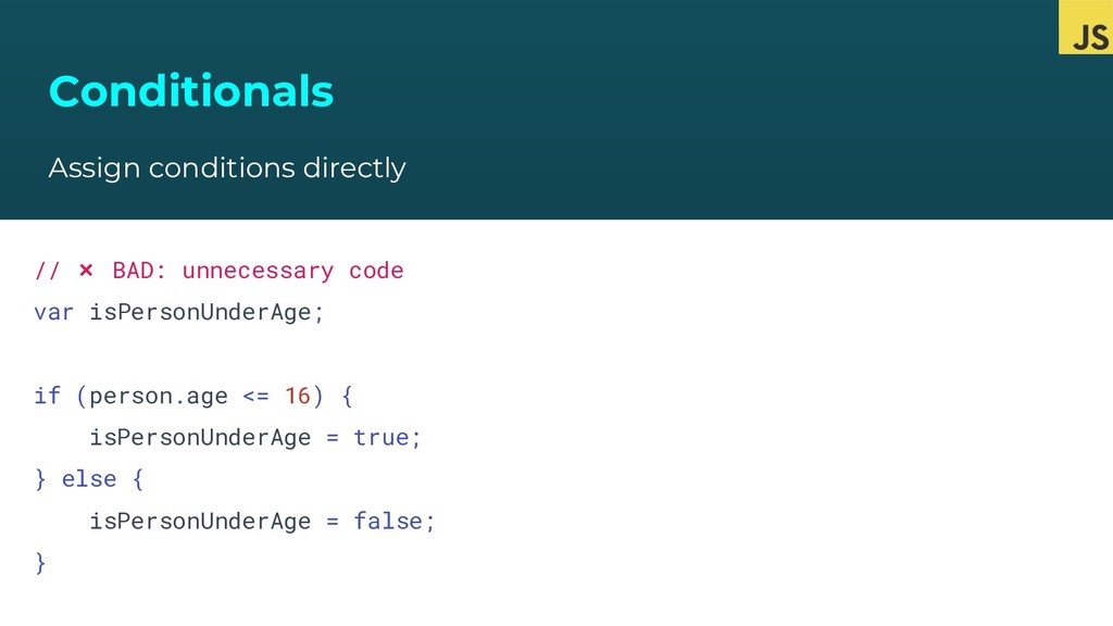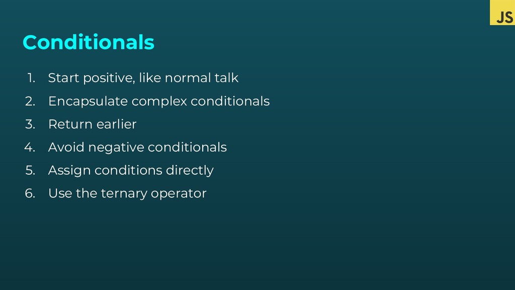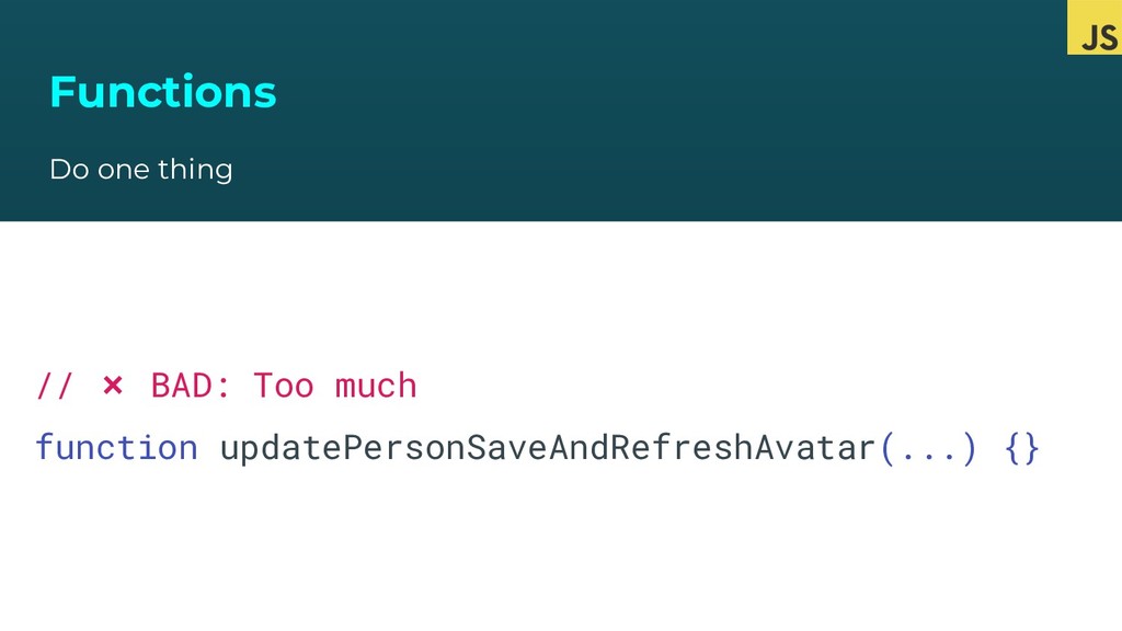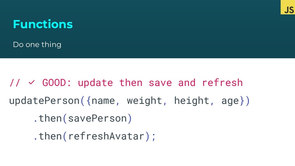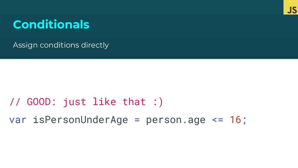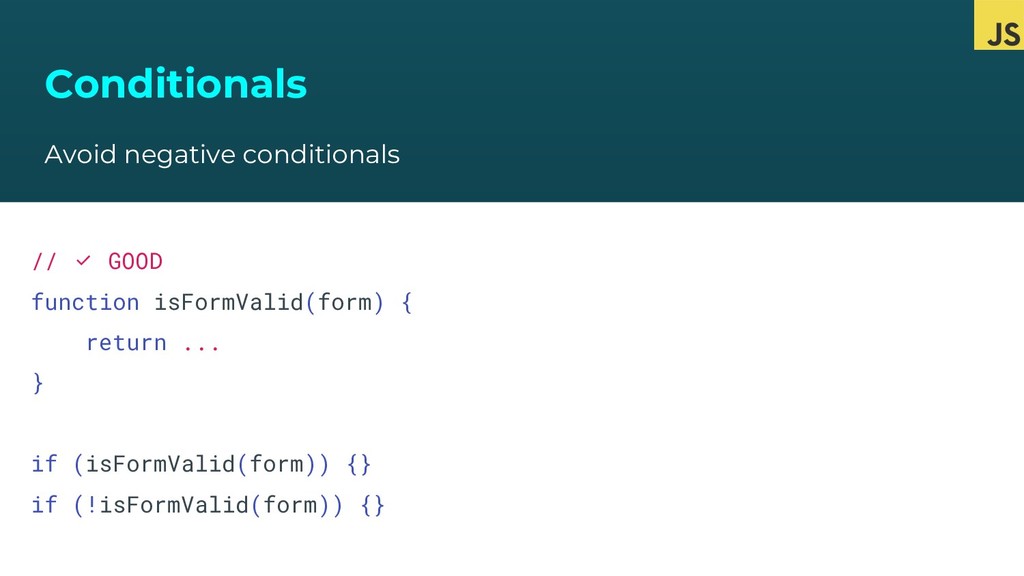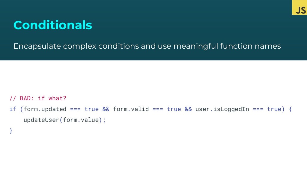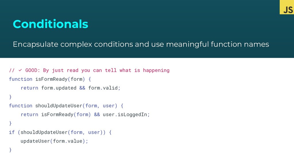 ✅ GOOD: By just read you can tell what is happening function isFormReady(form) { return form.updated && form.valid; } function shouldUpdateUser(form, user) { return isFormReady(form) && user.isLoggedIn; } if (shouldUpdateUser(form, user)) { updateUser(form.value); }