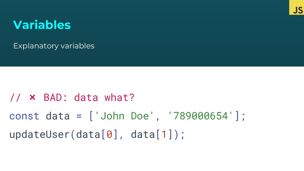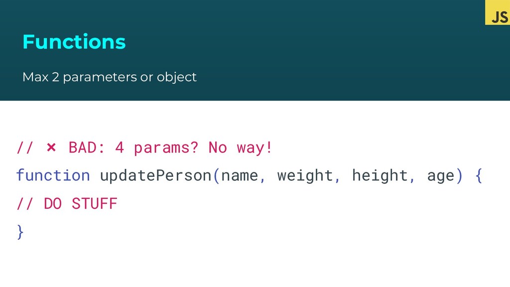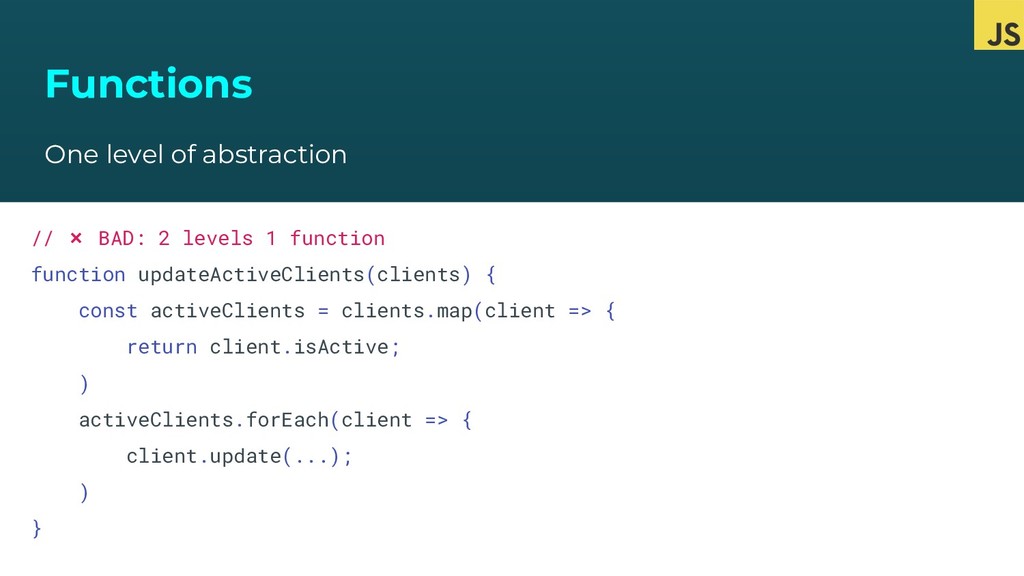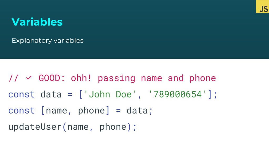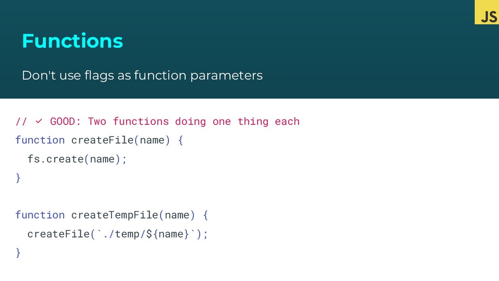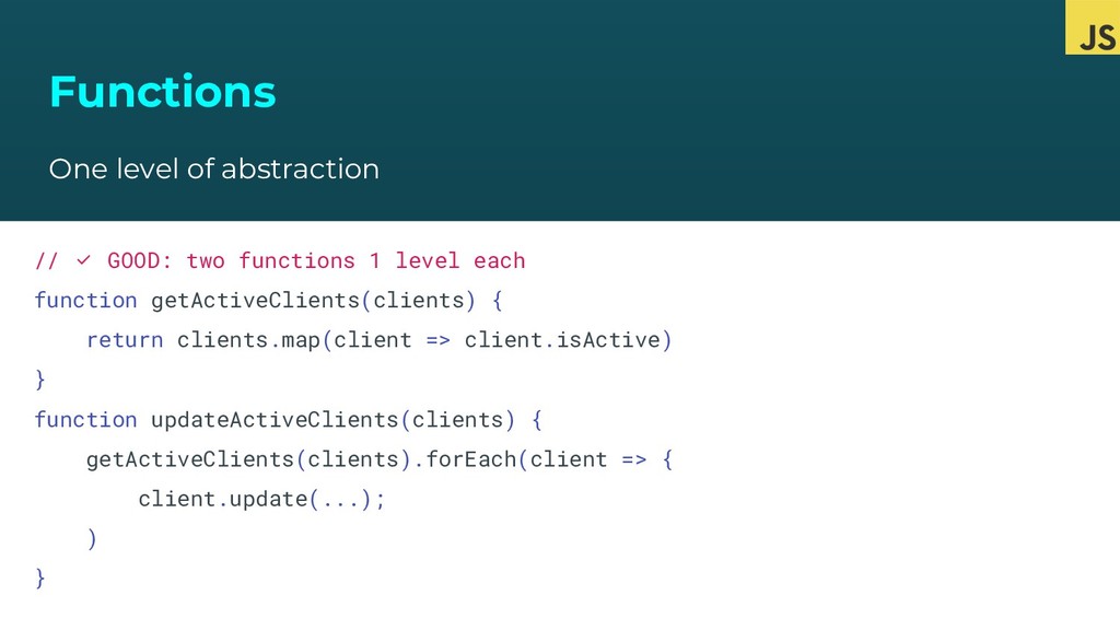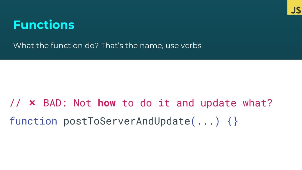 ✅ GOOD: By just read you can tell what is happening function isFormReady(form) { return form.updated && form.valid; } function shouldUpdateUser(form, user) { return isFormReady(form) && user.isLoggedIn; } if (shouldUpdateUser(form, user)) { updateUser(form.value); }