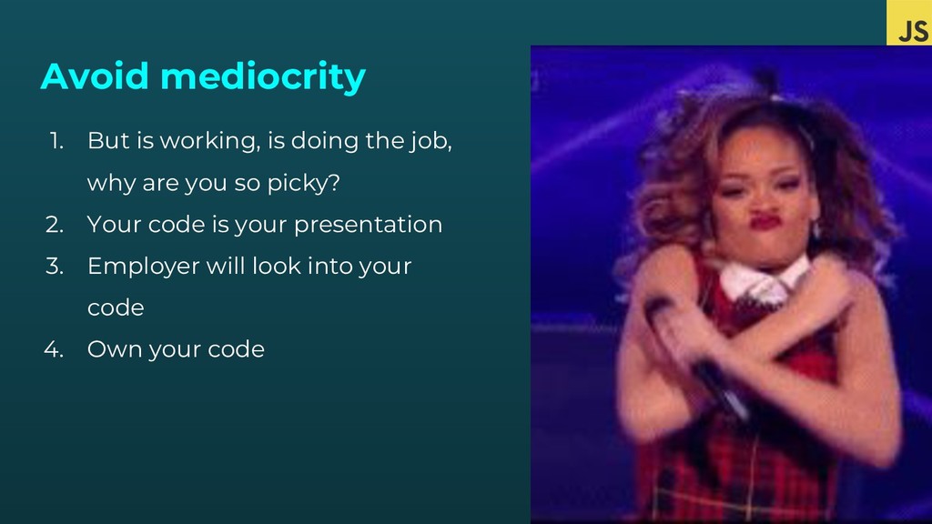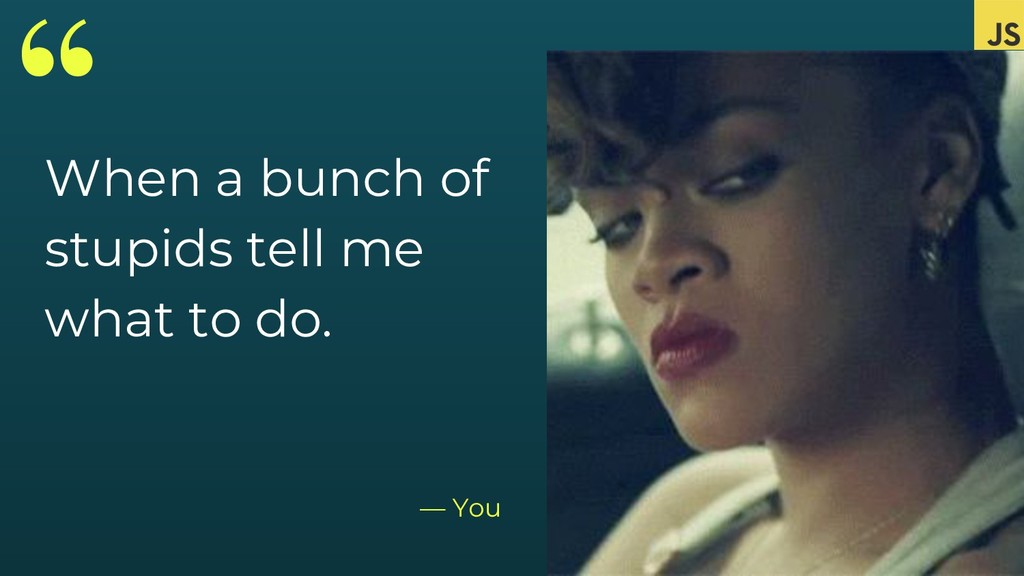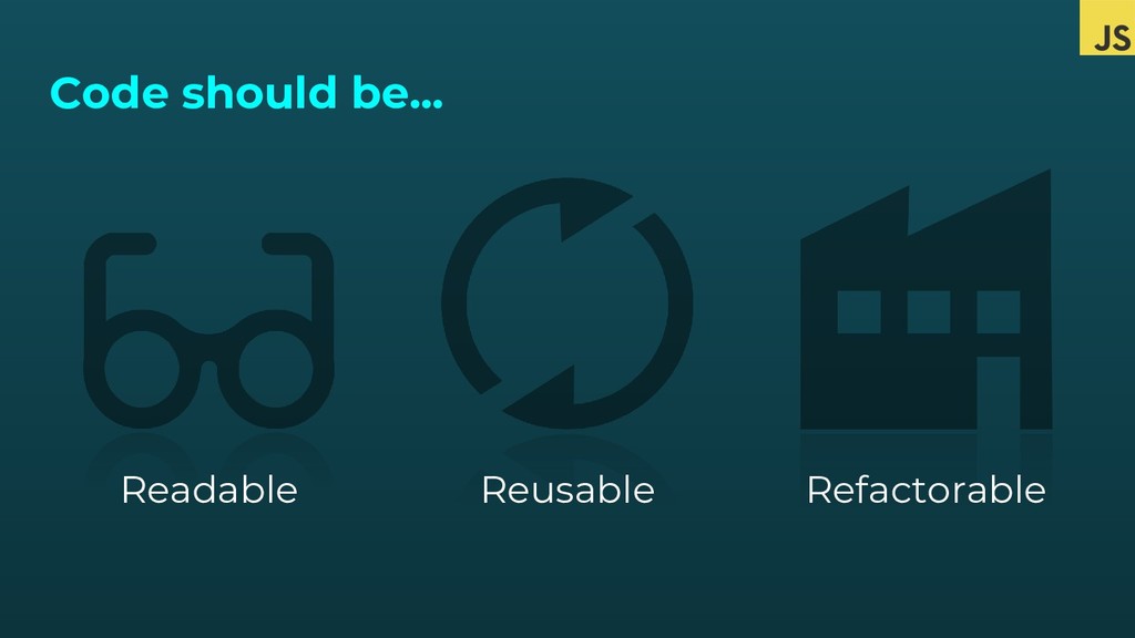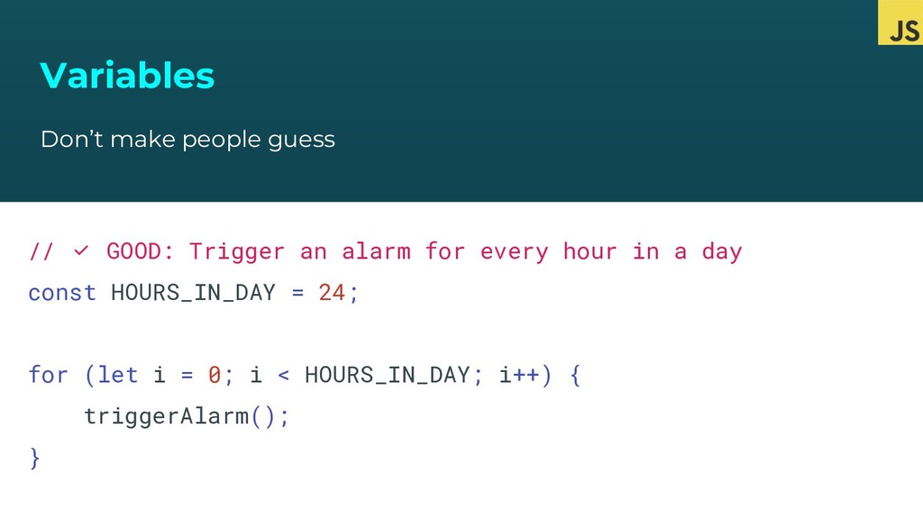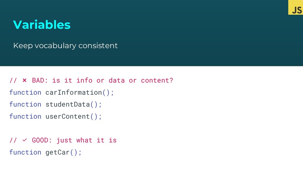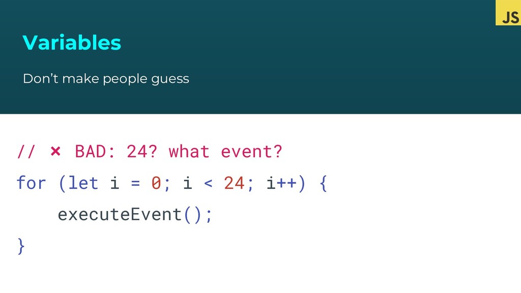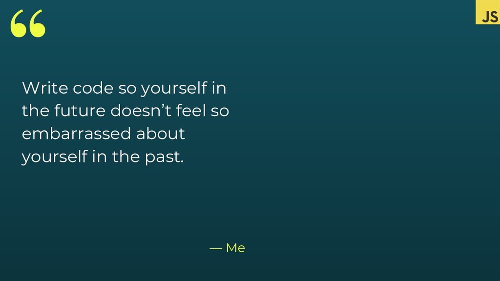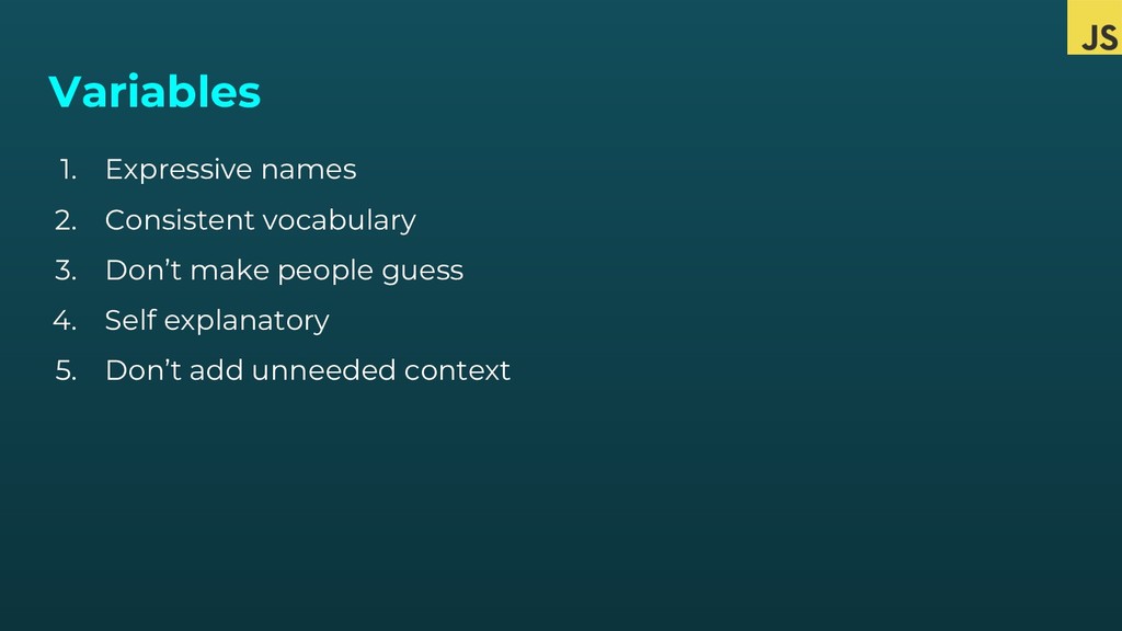 ✅ GOOD: By just read you can tell what is happening function isFormReady(form) { return form.updated && form.valid; } function shouldUpdateUser(form, user) { return isFormReady(form) && user.isLoggedIn; } if (shouldUpdateUser(form, user)) { updateUser(form.value); }
