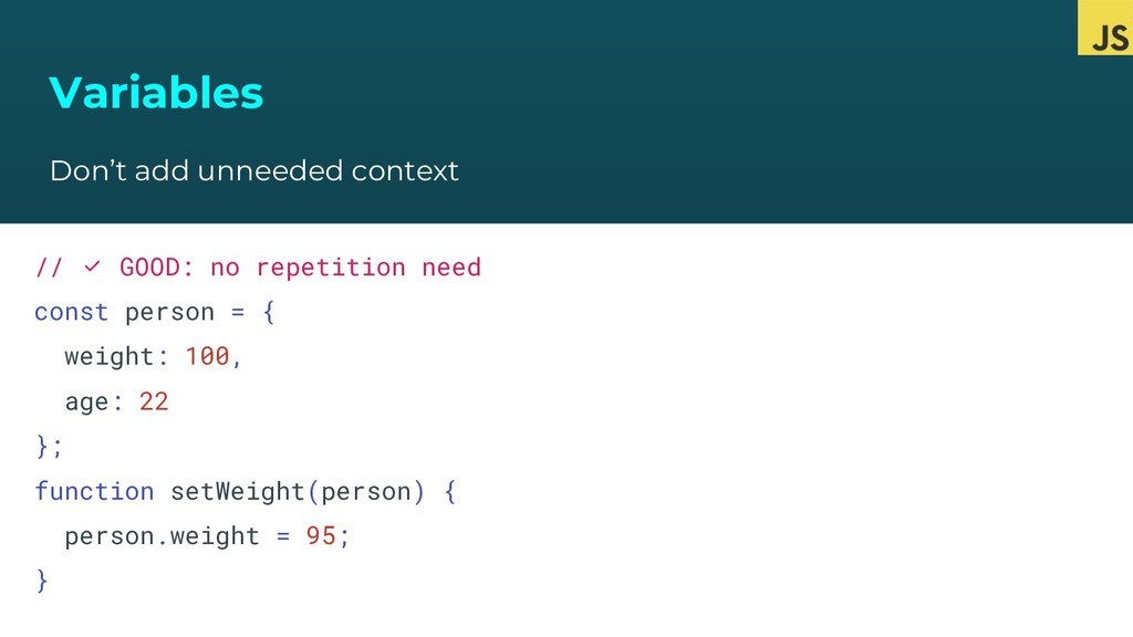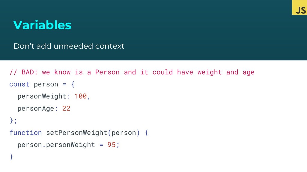 a Person and it could have weight and age const person = { personWeight: 100, personAge: 22 }; function setPersonWeight(person) { person.personWeight = 95; }