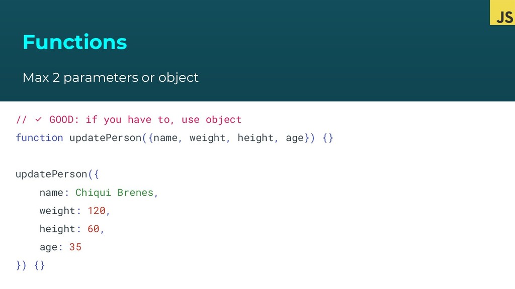 you have to, use object function updatePerson({name, weight, height, age}) {} updatePerson({ name: Chiqui Brenes, weight: 120, height: 60, age: 35 }) {}
