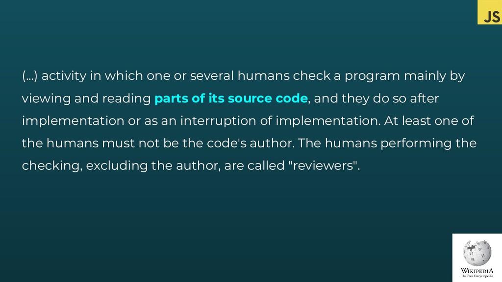 program mainly by viewing and reading parts of its source code, and they do so after implementation or as an interruption of implementation. At least one of the humans must not be the code's author. The humans performing the checking, excluding the author, are called "reviewers".