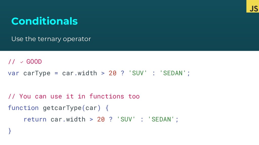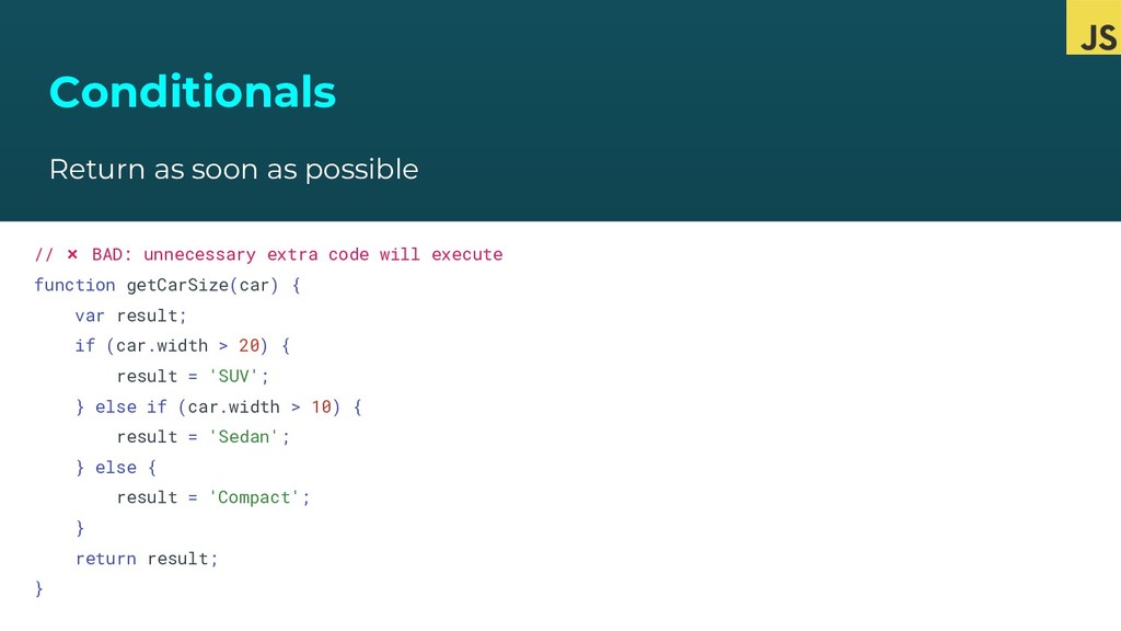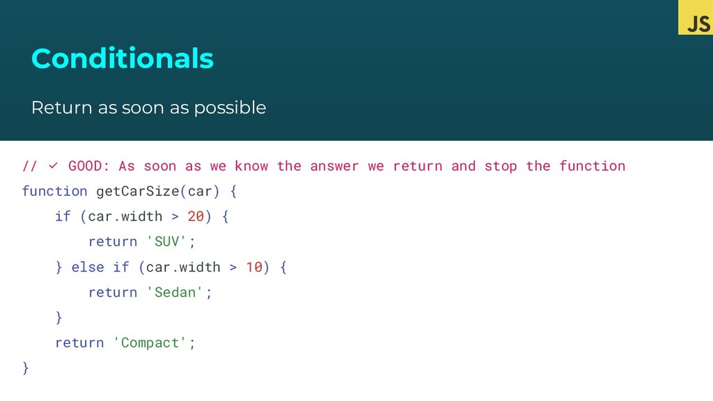 soon as we know the answer we return and stop the function function getCarSize(car) { if (car.width > 20) { return 'SUV'; } else if (car.width > 10) { return 'Sedan'; } return 'Compact'; }
