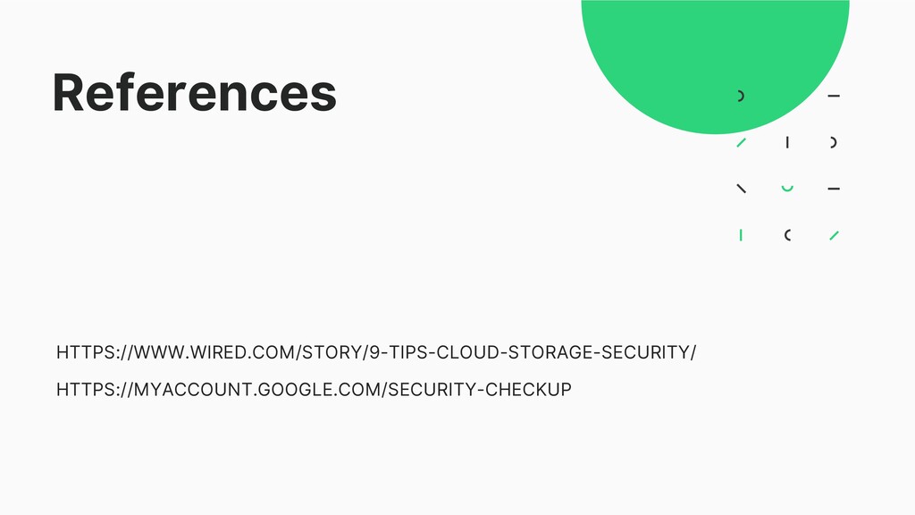 References HTTPS://MYACCOUNT.GOOGLE.COM/SECURITY-CHECKUP HTTPS://WWW.WIRED.COM/STORY/9-TIPS-CLOUD-STORAGE-SECURITY/