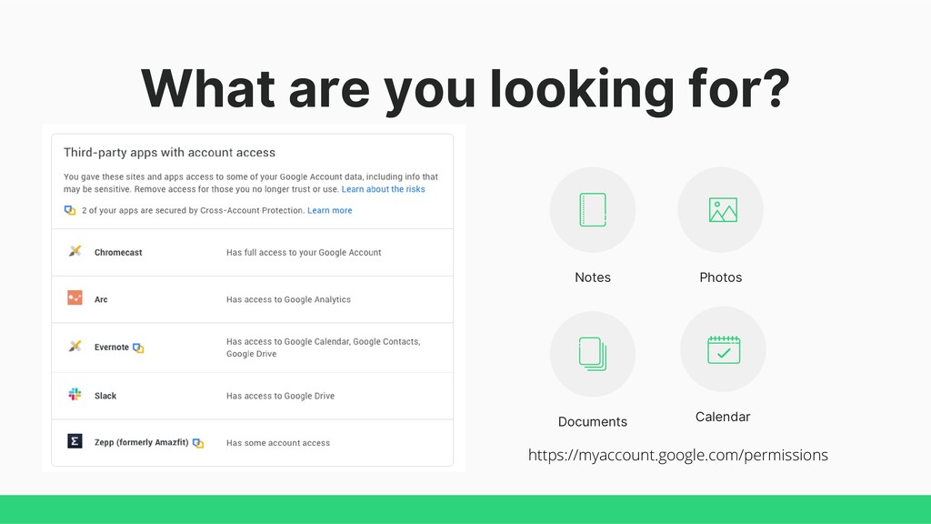 What are you looking for? Photos Notes Documents Calendar https://myaccount.google.com/permissions