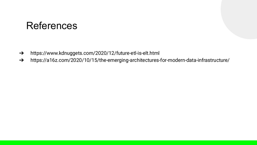 References ➔ https://www.kdnuggets.com/2020/12/future-etl-is-elt.html ➔ https://a16z.com/2020/10/15/the-emerging-architectures-for-modern-data-infrastructure/