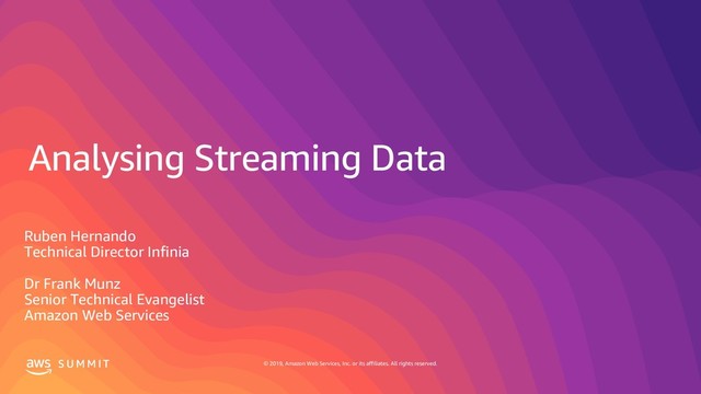 rights reserved. S U M M I T Ruben Hernando Technical Director Infinia Dr Frank Munz Senior Technical Evangelist Amazon Web Services Analysing Streaming Data