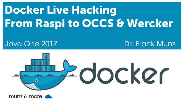 cloud / just Docker is not enough / #swarm is the easier #k8s / not a security risk / many products offered as images / OCCS & Wercker saves you from heavy lifting / Oracle caught the trend! / consider cloud services. @frankmunz