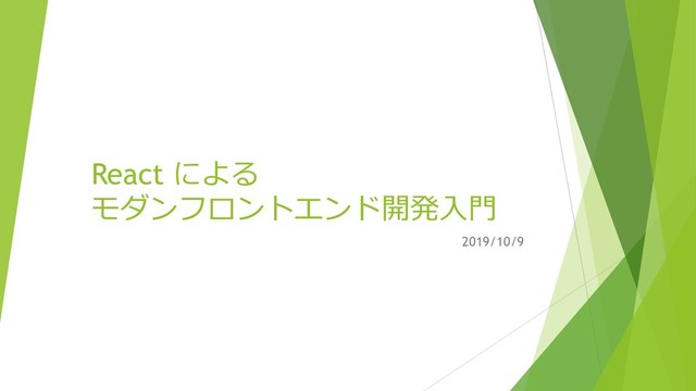 は JavaScript eXtension で JavaScript の拡張 u あくまでも JavaScript で以下の2つはJSXで同じ意味になる u とは⾔え、JSX は基本的に HTML と同じように記述できる u 独⾃タグを作成することもできる u タグ属性の class -> className, for -> htmlFor は例外 u 変数の記述は以下のようにする u {変数} ・・・これで変数が展開される <h1>Hello,world!</h1> React.createElement("h1", "Hello,world!");