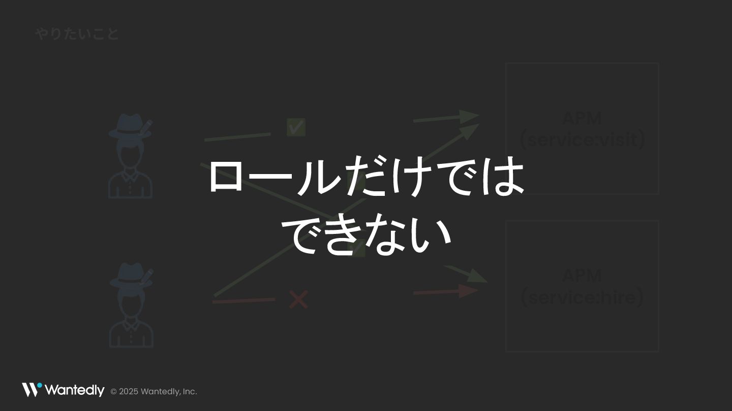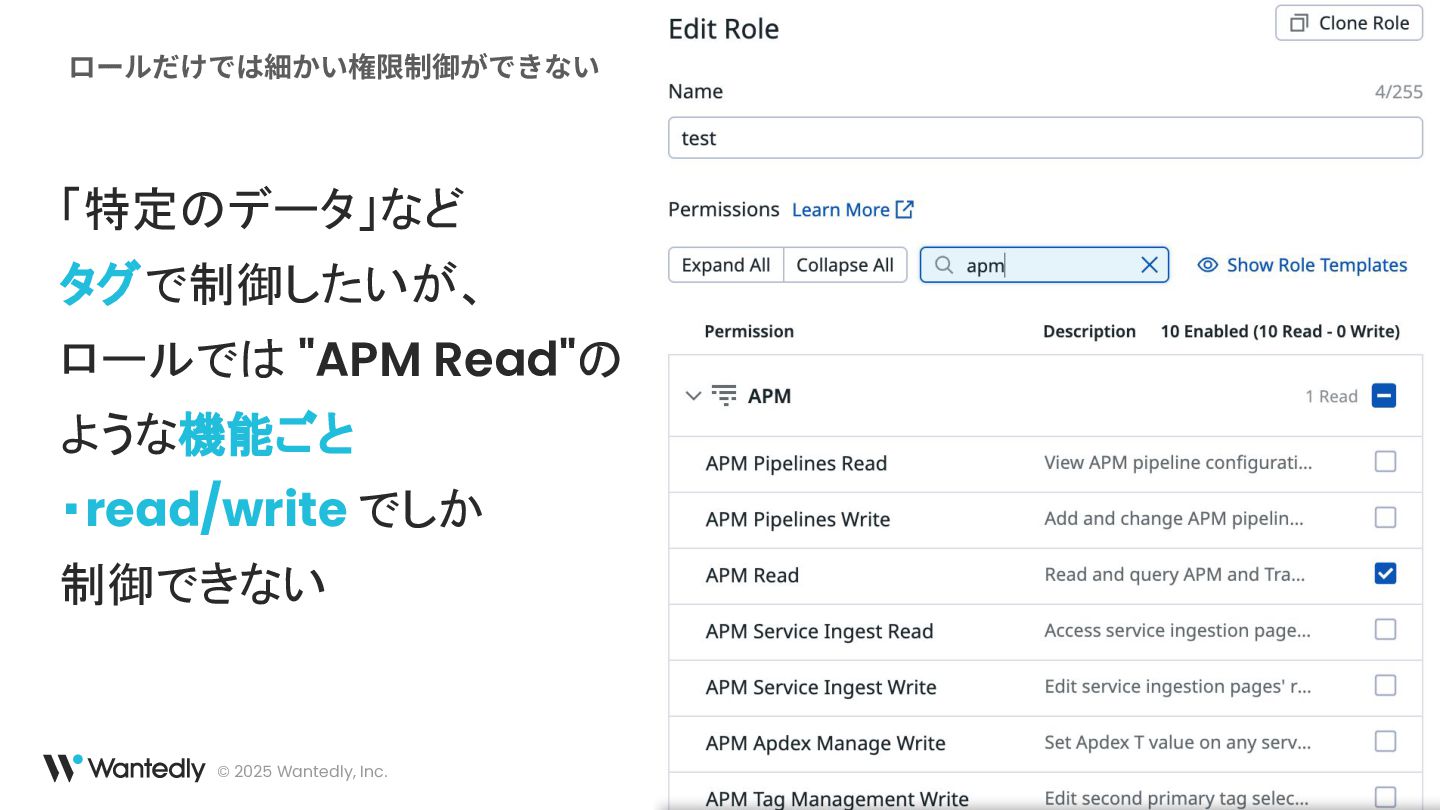 © 2025 Wantedly, Inc. ロールだけでは細かい権限制御ができない 「特定のデータ」など タグで制御したいが、 ロールでは "APM Read"の
