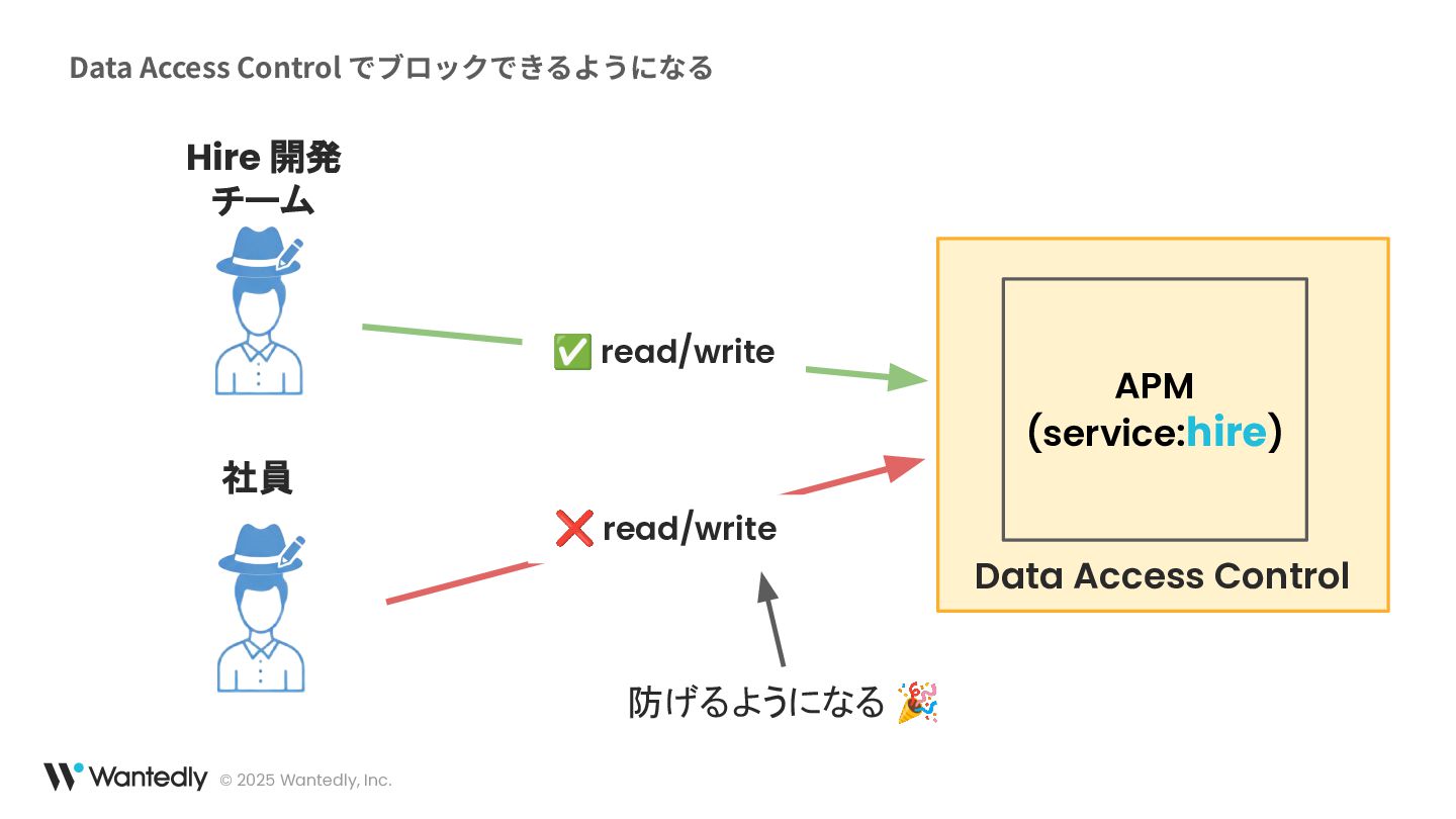 でブロックできるようになる Hire 開発 チーム ❌ read/write APM (service:hire) 社員 ✅ read/write 防げるようになる 🎉