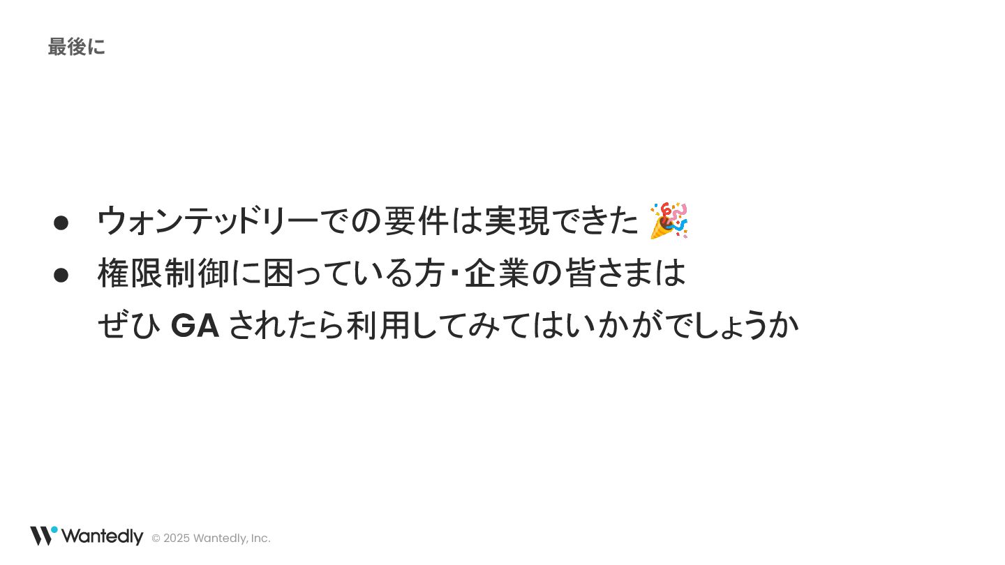 © 2025 Wantedly, Inc. 最後に • ウォンテッドリーでの要件は実現できた 🎉 • 権限制御に困っている方・企業の皆さまは