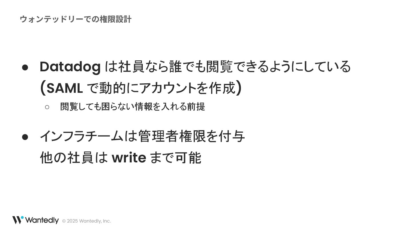 © 2025 Wantedly, Inc. ウォンテッドリーでの権限設計 • Datadog は社員なら誰でも閲覧できるようにしている (SAML で動的にアカウントを作成)