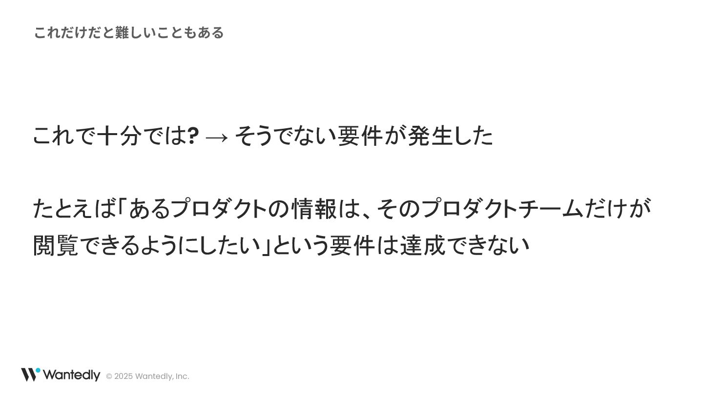 © 2025 Wantedly, Inc. これだけだと難しいこともある これで十分では? → そうでない要件が発生した たとえば「あるプロダクトの情報は、そのプロダクトチームだけが 閲覧できるようにしたい」という要件は達成できない