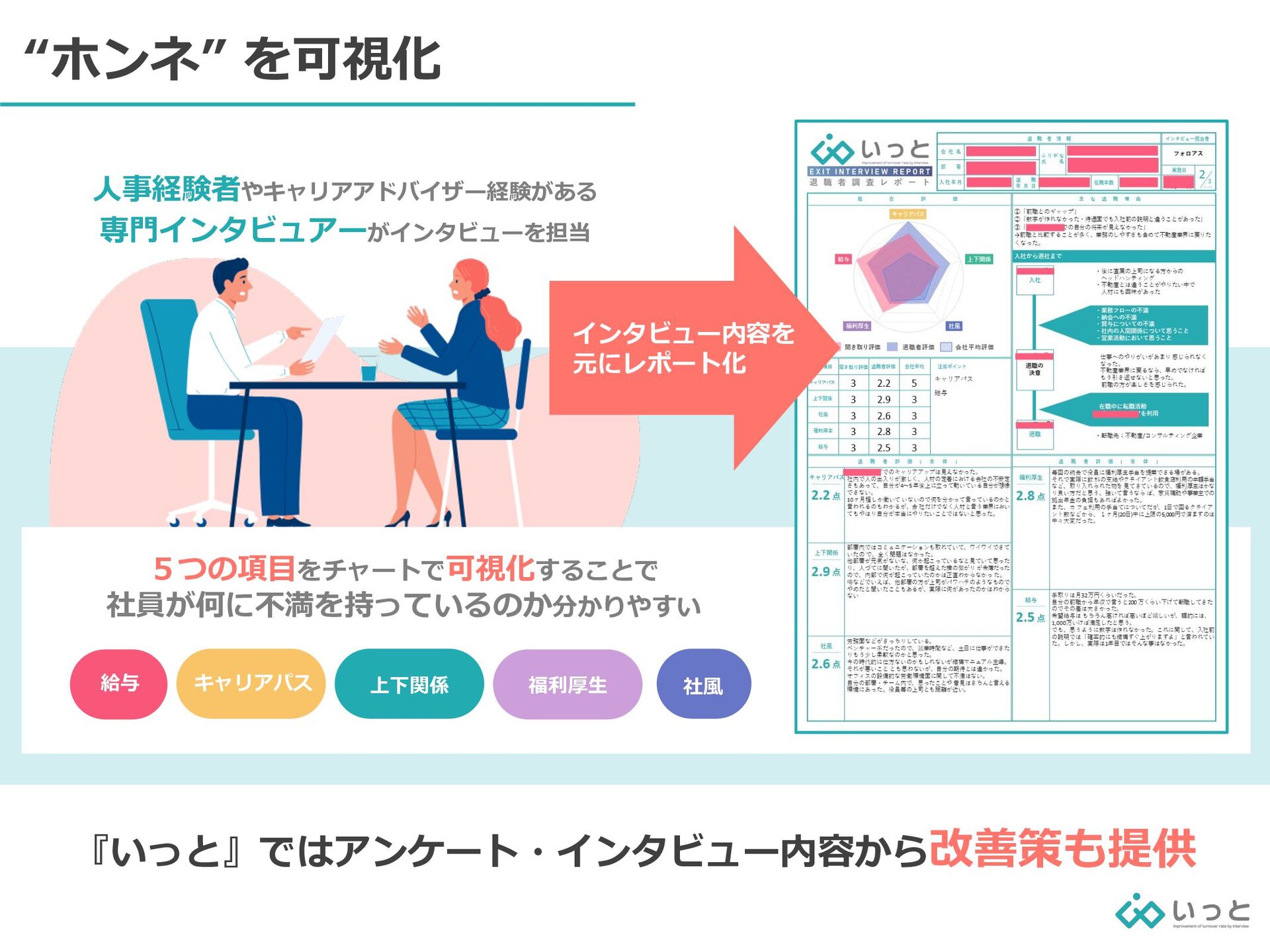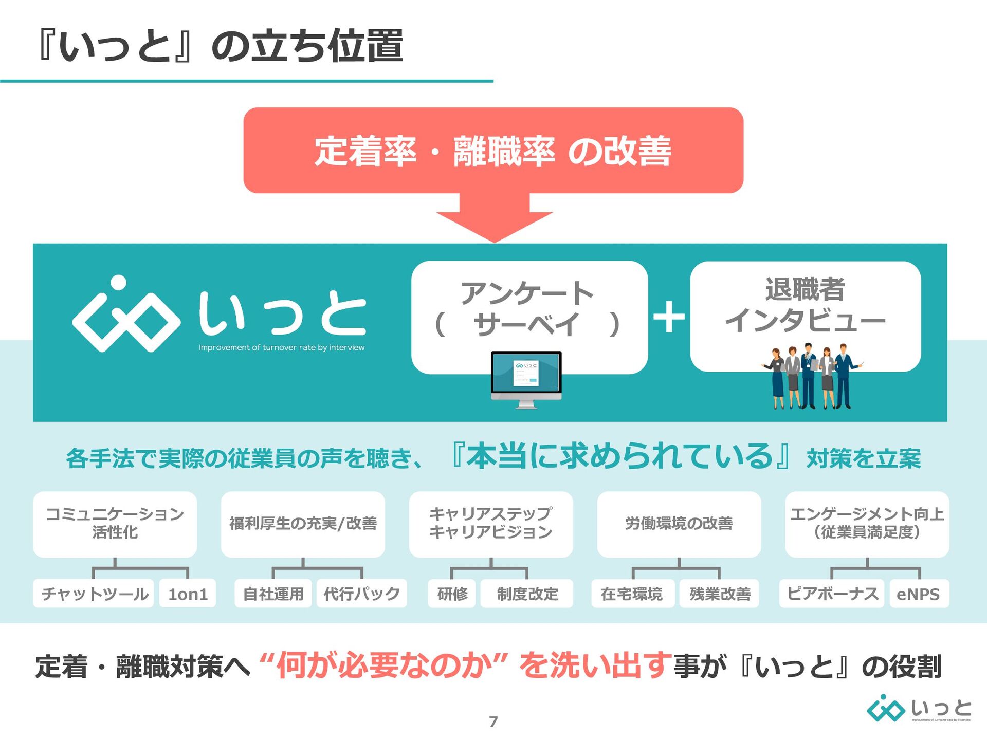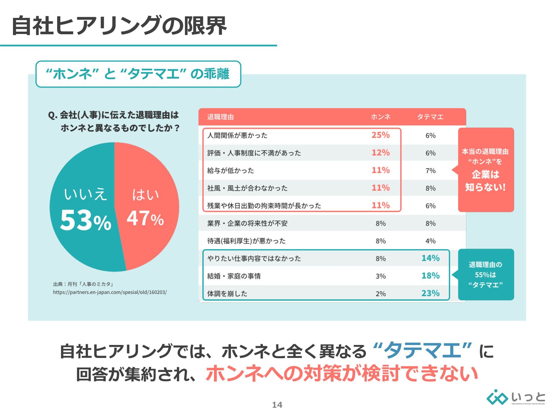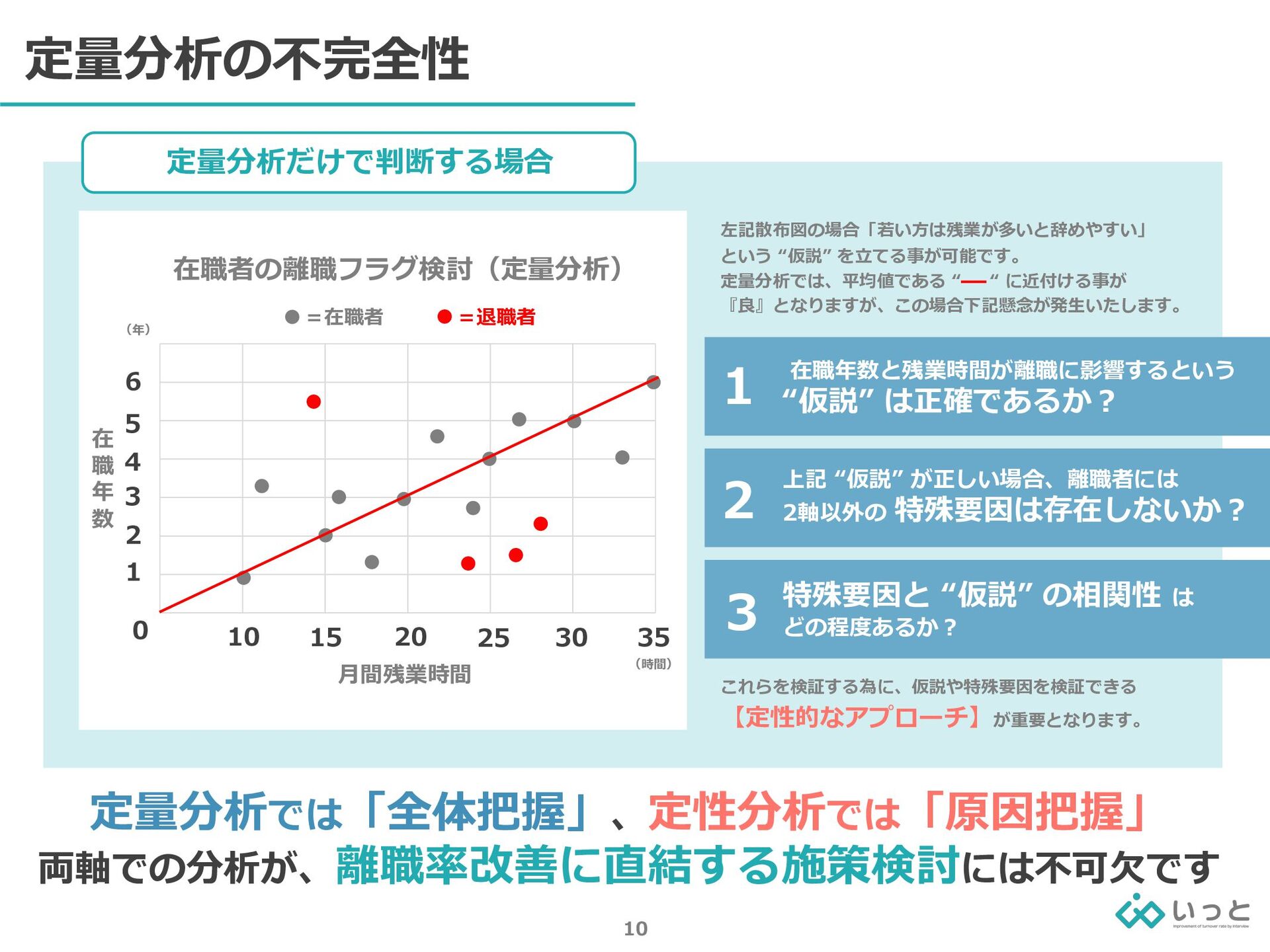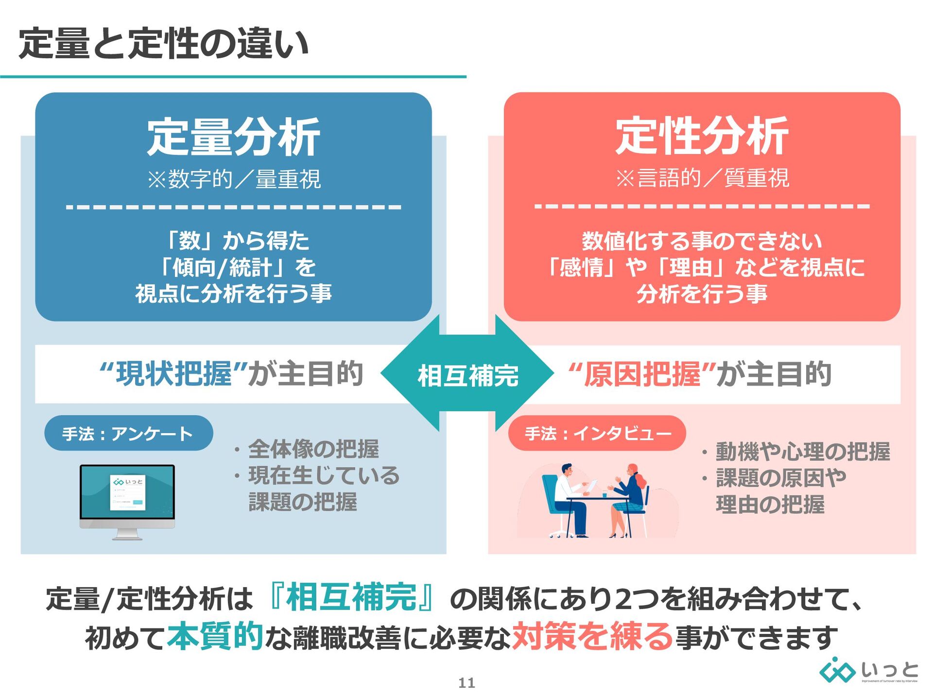 6 5 10 20 15 25 35 30 (年) (時間) 0 左記散布図の場合「若い⽅は残業が多いと辞めやすい」 という “仮説” を⽴てる事が可能です。 定量分析では、平均値である “ “ に近付ける事が 『良』となりますが、この場合下記懸念が発⽣いたします。 =在職者 =退職者 10 在職年数と残業時間が離職に影響するという “仮説” は正確であるか︖ これらを検証する為に、仮説や特殊要因を検証できる 【定性的なアプローチ】が重要となります。 上記 “仮説” が正しい場合、離職者には 2軸以外の 特殊要因は存在しないか︖ 特殊要因と “仮説” の相関性 は どの程度あるか︖ 1 2 3 定量分析の不完全性 定量分析では「全体把握」、定性分析では「原因把握」 両軸での分析が、離職率改善に直結する施策検討には不可⽋です 在職者の離職フラグ検討(定量分析)