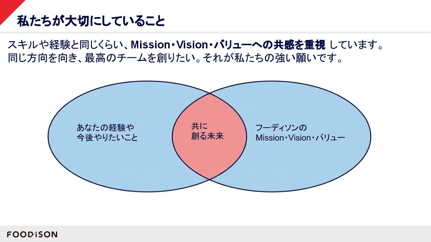 私たちが大切にしていること スキルや経験と同じくらい、Mission・Vision・バリューへの共感を重視 しています。 同じ方向を向き、最高のチームを創りたい。それが私たちの強い願いです。 共に 創る未来 あなたの経験や 今後やりたいこと フーディソンの Mission・Vision・バリュー