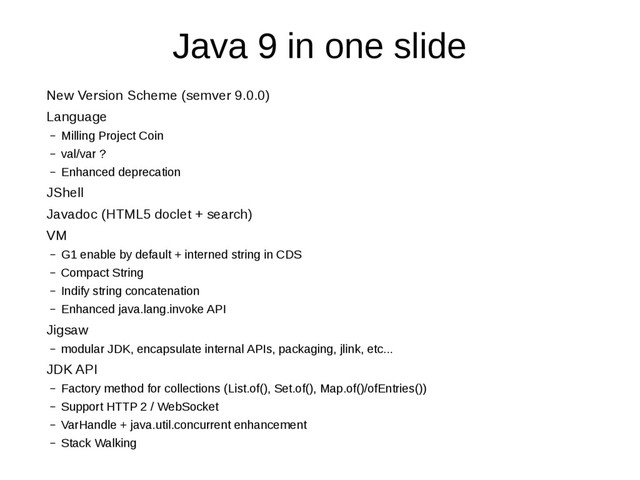 Java 9 in one slide New Version Scheme (semver 9.0.0)