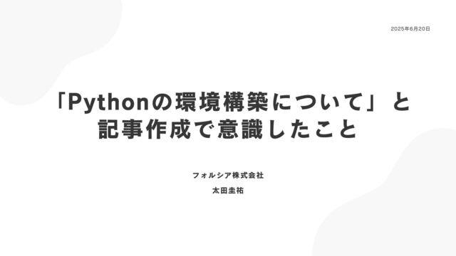 2025/6/20開催Shinjuku.md#2LT資料 ブログ「【2024年版】めっちゃ使いやすいPythonの開発環境をVSCode上で構築する方法」:https://zenn.dev/forcia_tech/articles/202409_python_environment_construction