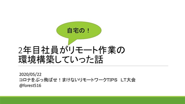 2年目社員がリモート作業の 環境構築していった話 自宅の! 2020/05/22 コロナをぶっ飛ばせ!まけないリモートワークTIPS LT大会 @forest516